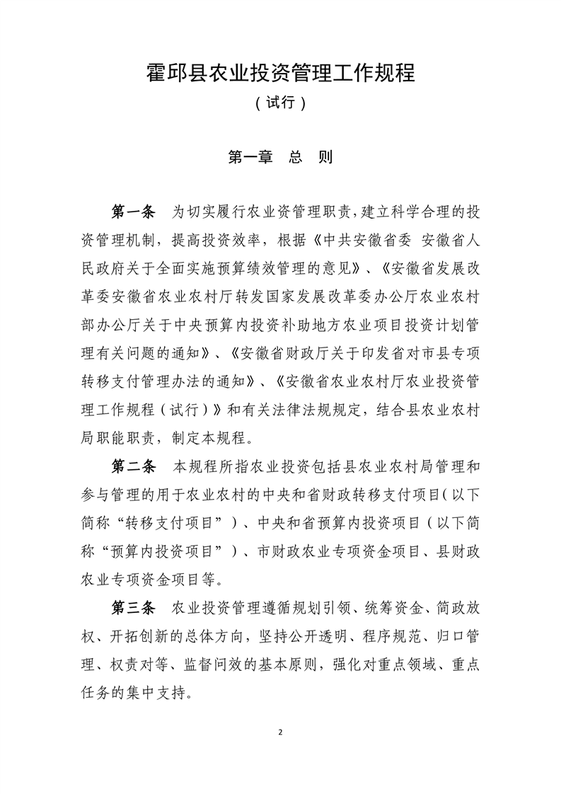 霍邱县农业农村局关于印发农业投资管理工作规程(试行)的通知