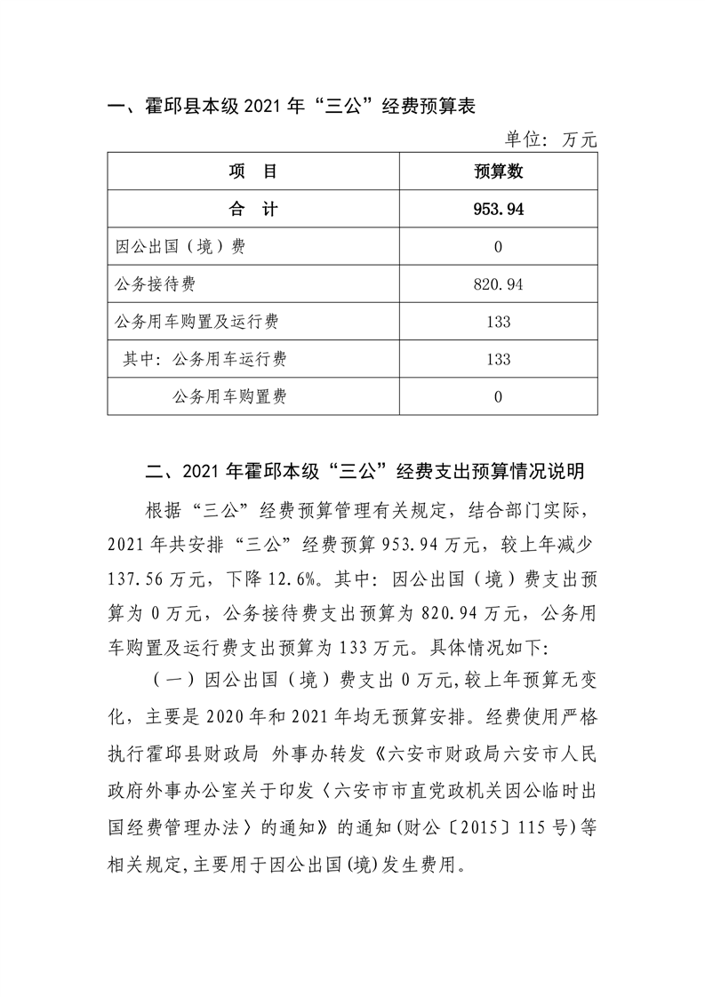 霍邱县本级2021年“三公”经费预算情况