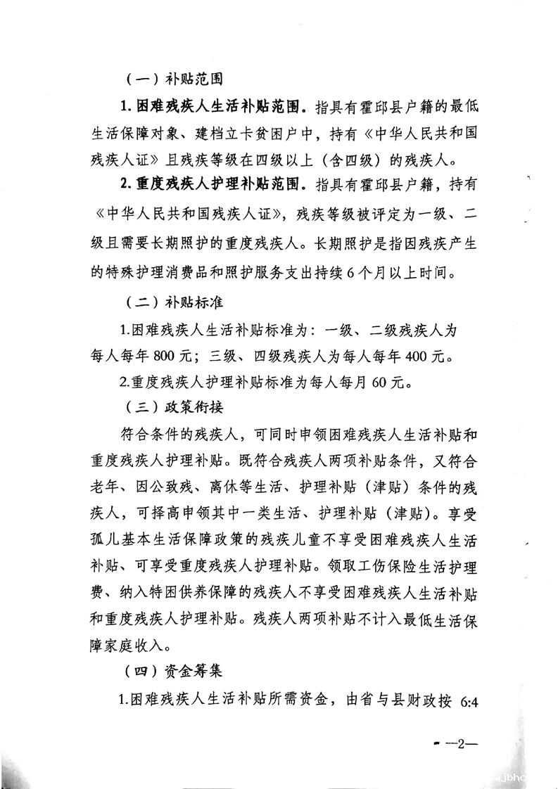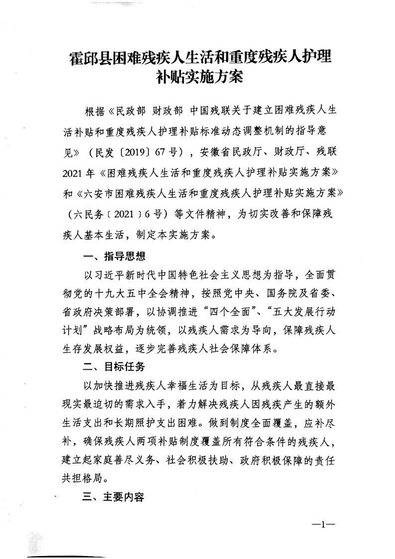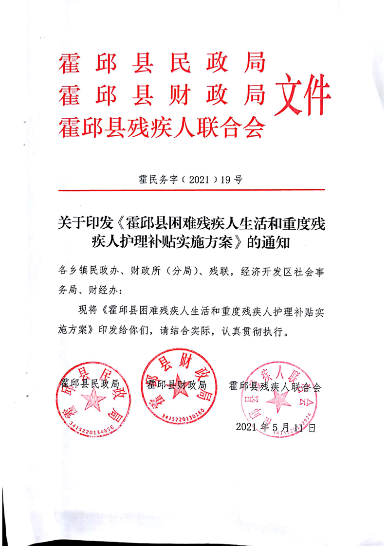 关于印发《霍邱县困难残疾人生活和重度残疾人护理补贴实施方案》的通知