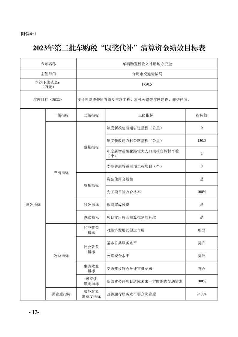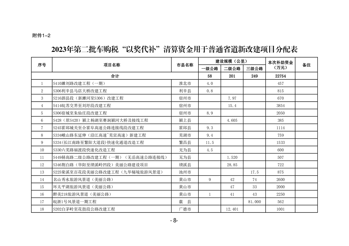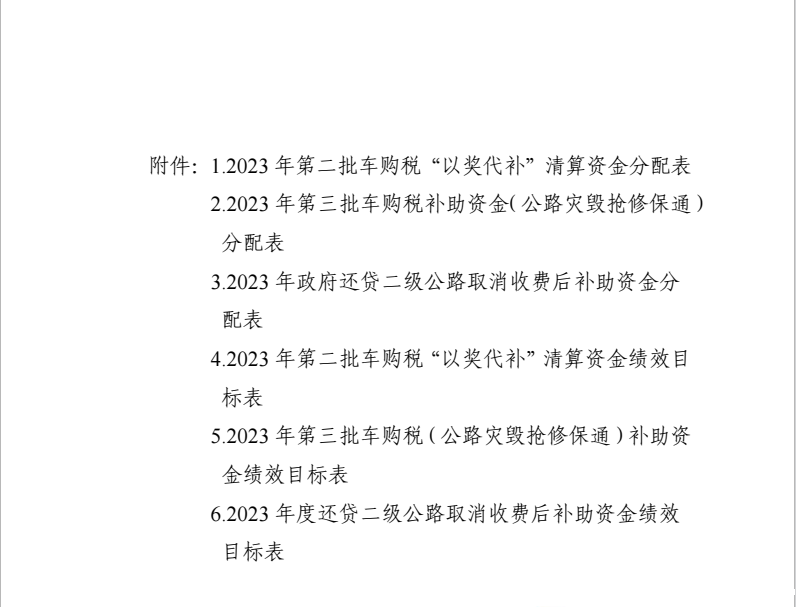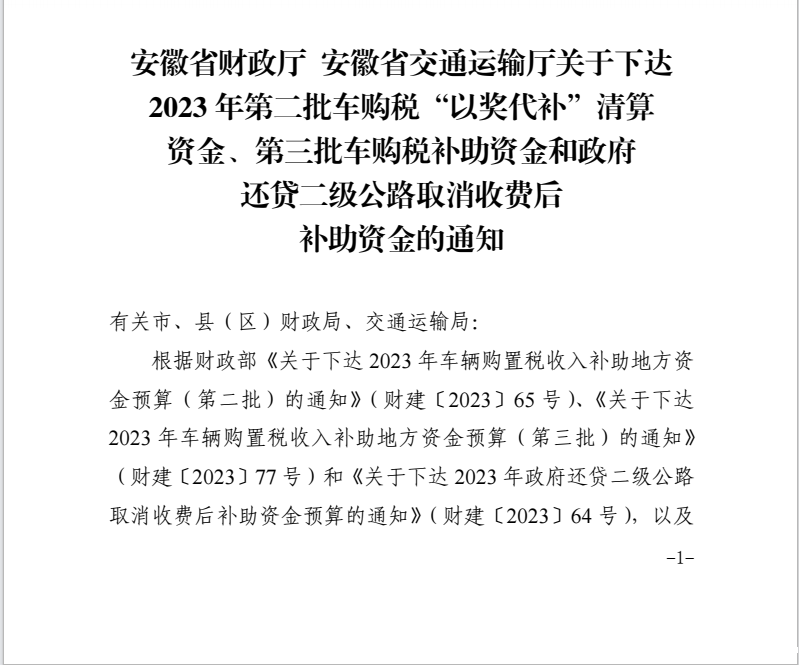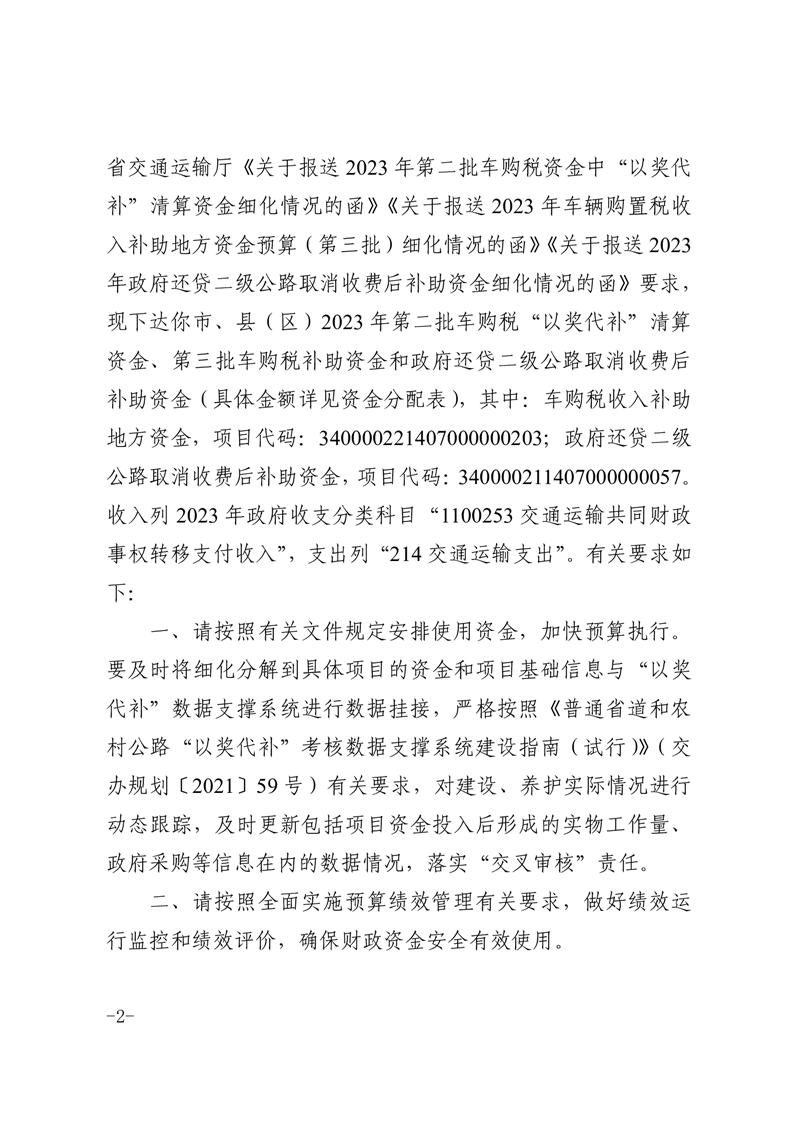 安徽省财政厅安徽省交通运输厅关于下达2023年第二批车购税“以奖代补”清算资金、第三批车购税补助资金和政府还贷二级公路取消收费后补助资金的通知