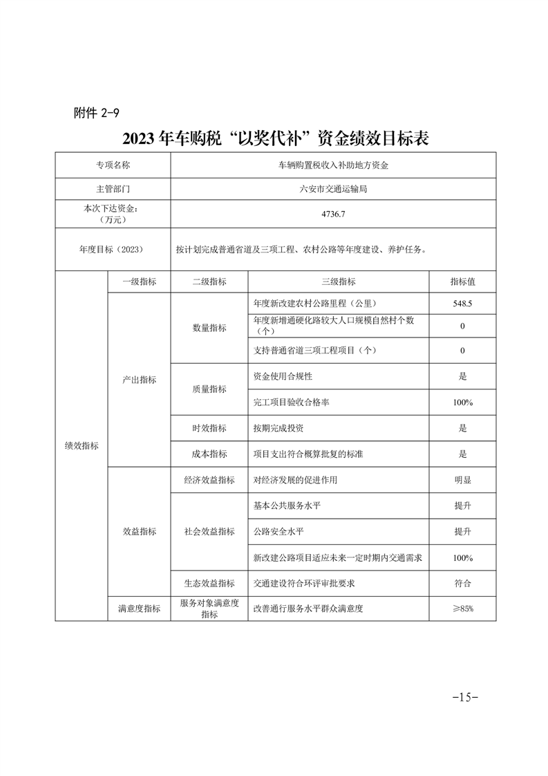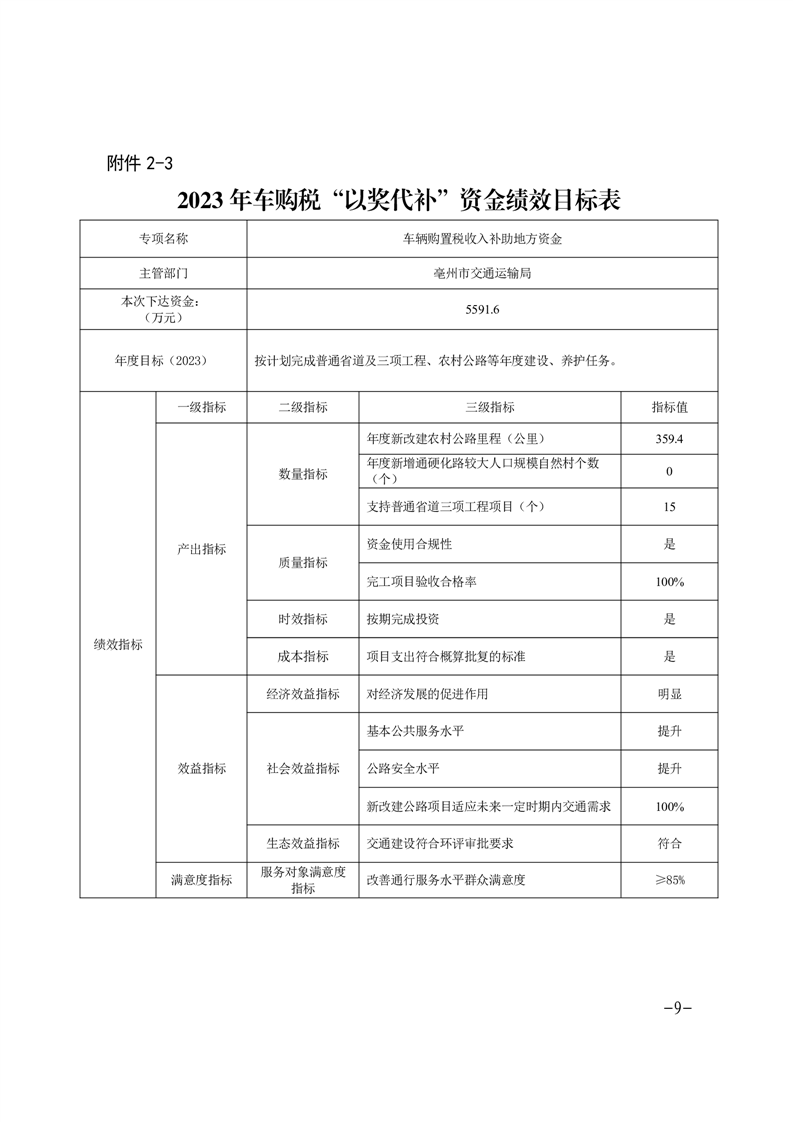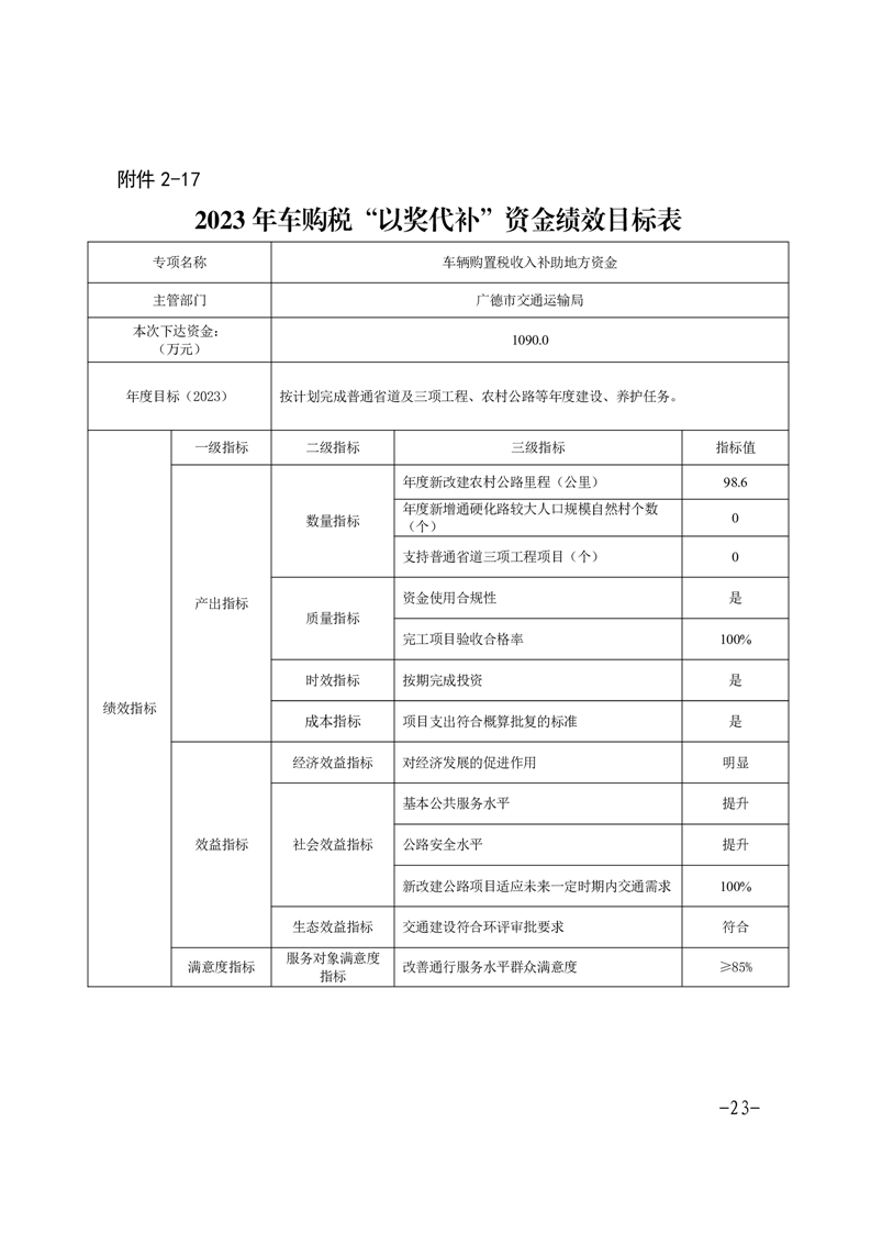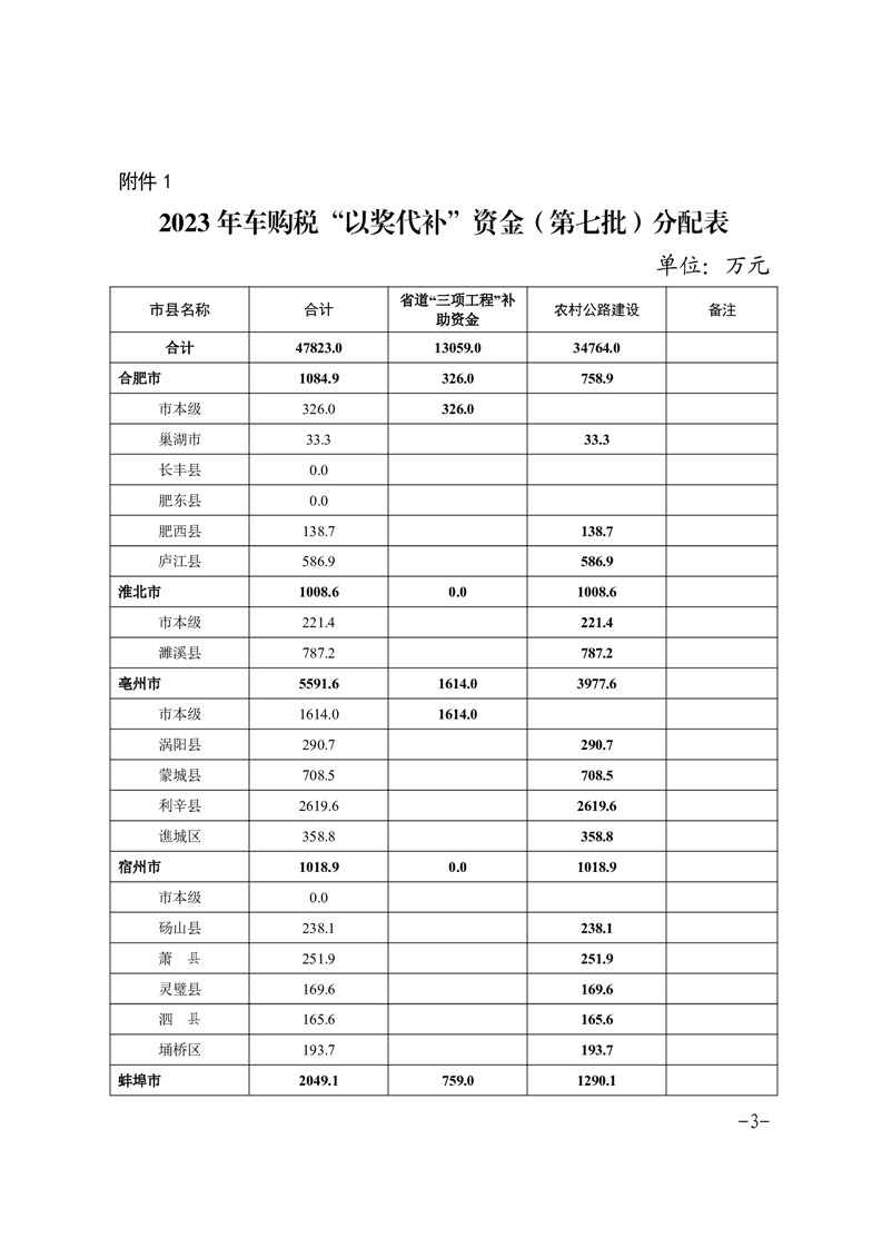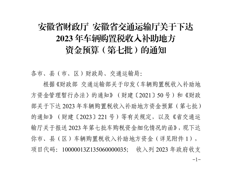 安徽省财政厅安徽省交通运输厅关于下达2023 年车辆购置税收入补助地方资金预算(第七批)的通知