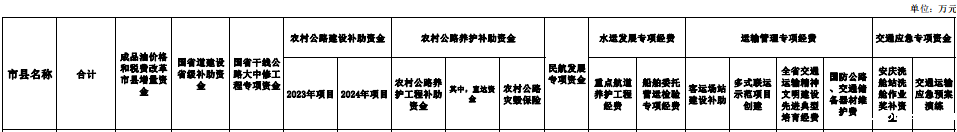 霍邱县2024年成品油价格和税费改革市县增量资金及省级交通运输专项资金(第一批)分配表
