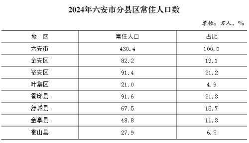 2024年末,全市常住人口430.4万人,比上年减少3.9万人,下降0.9%。各县区常住人口分布及占比情况如下: