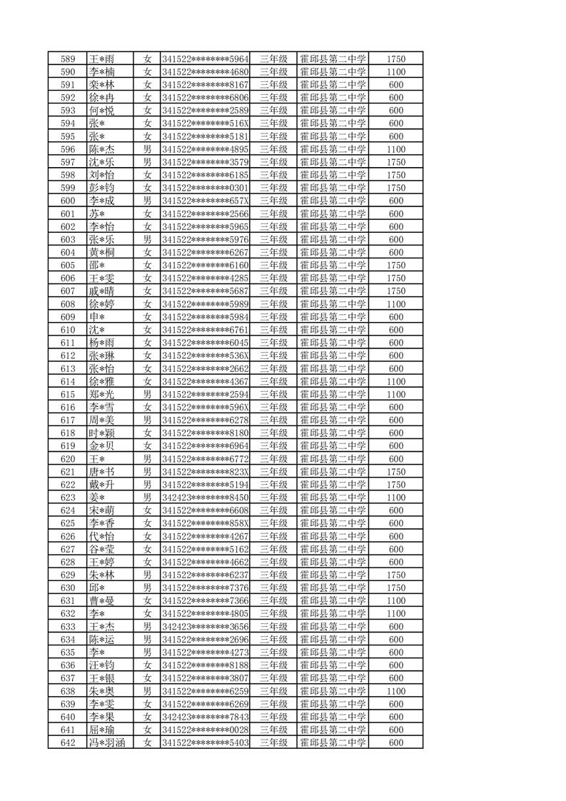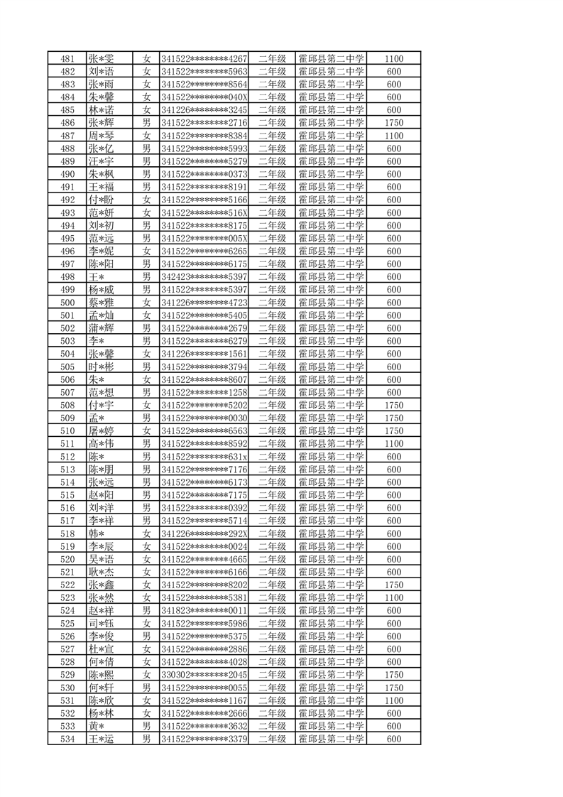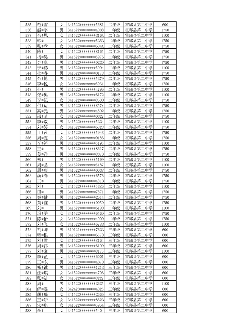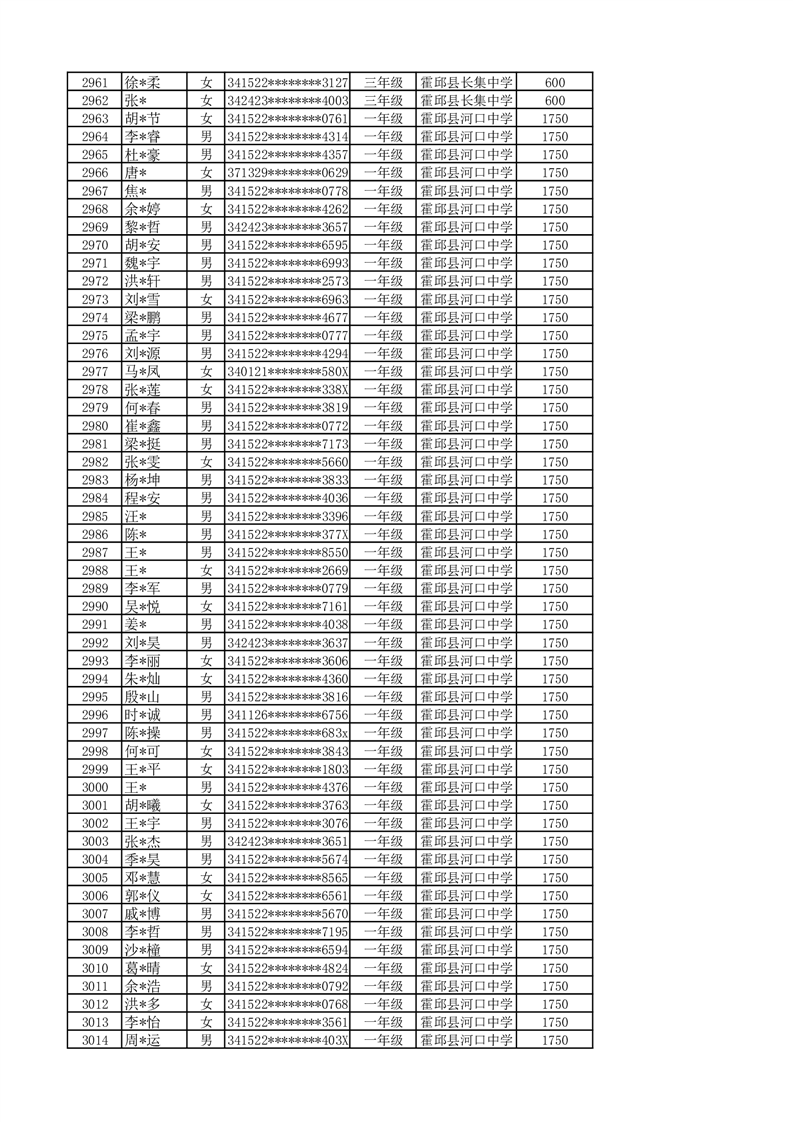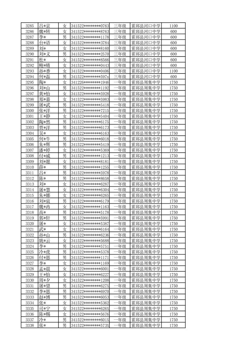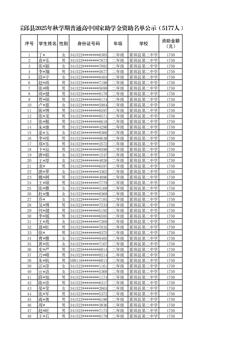 霍邱县2025年秋学期普通高中国家助学金资助名单公示(5177人)