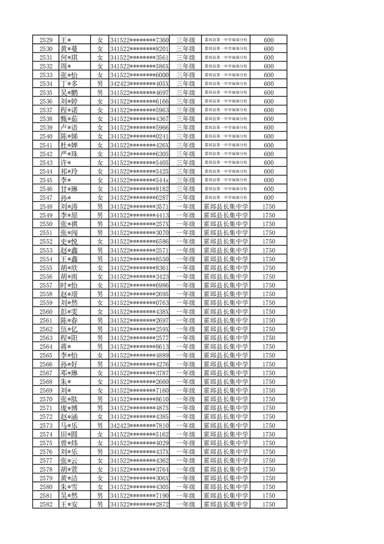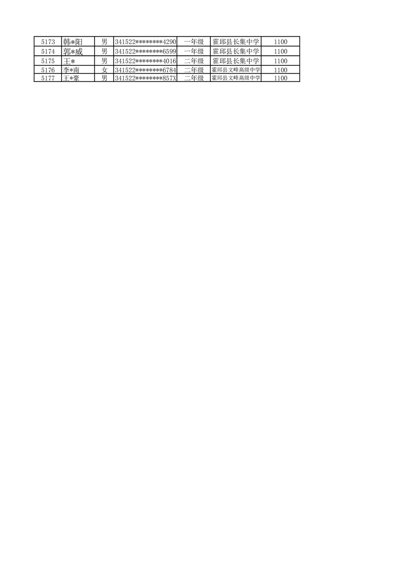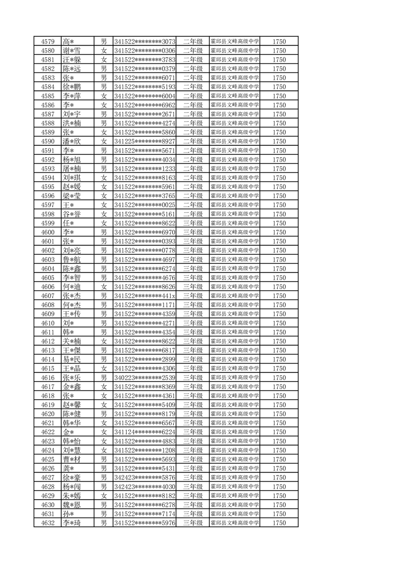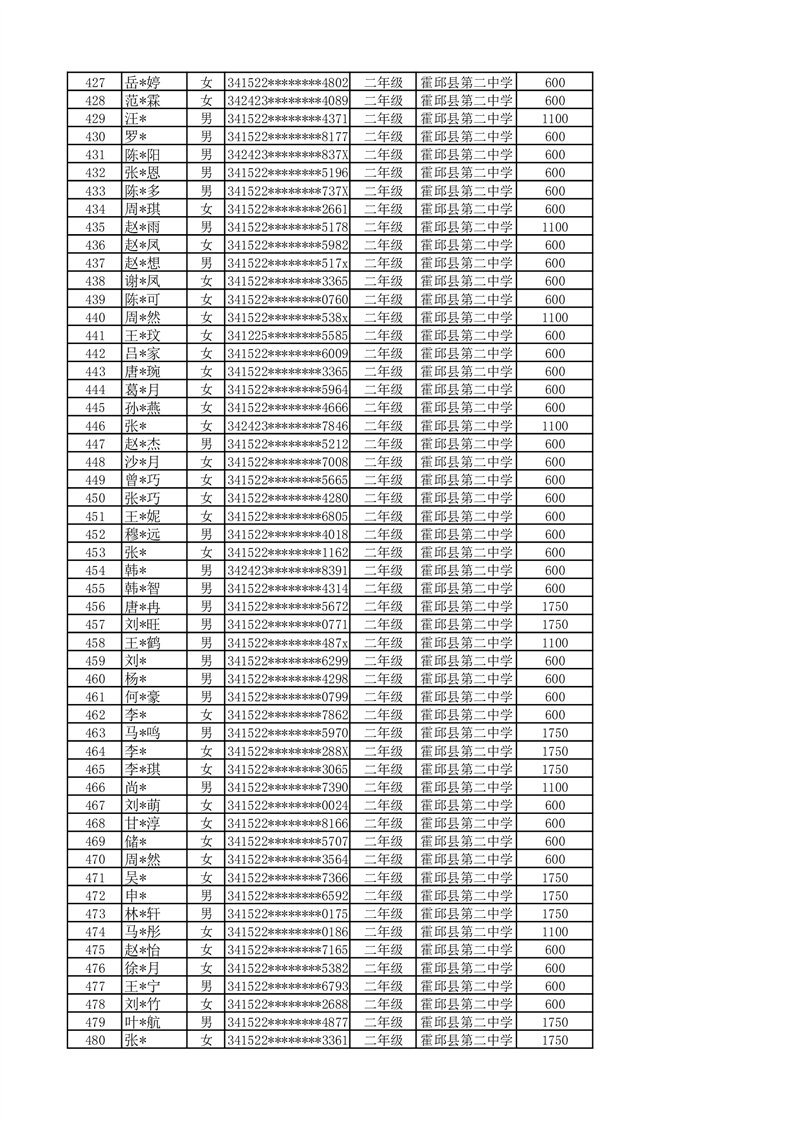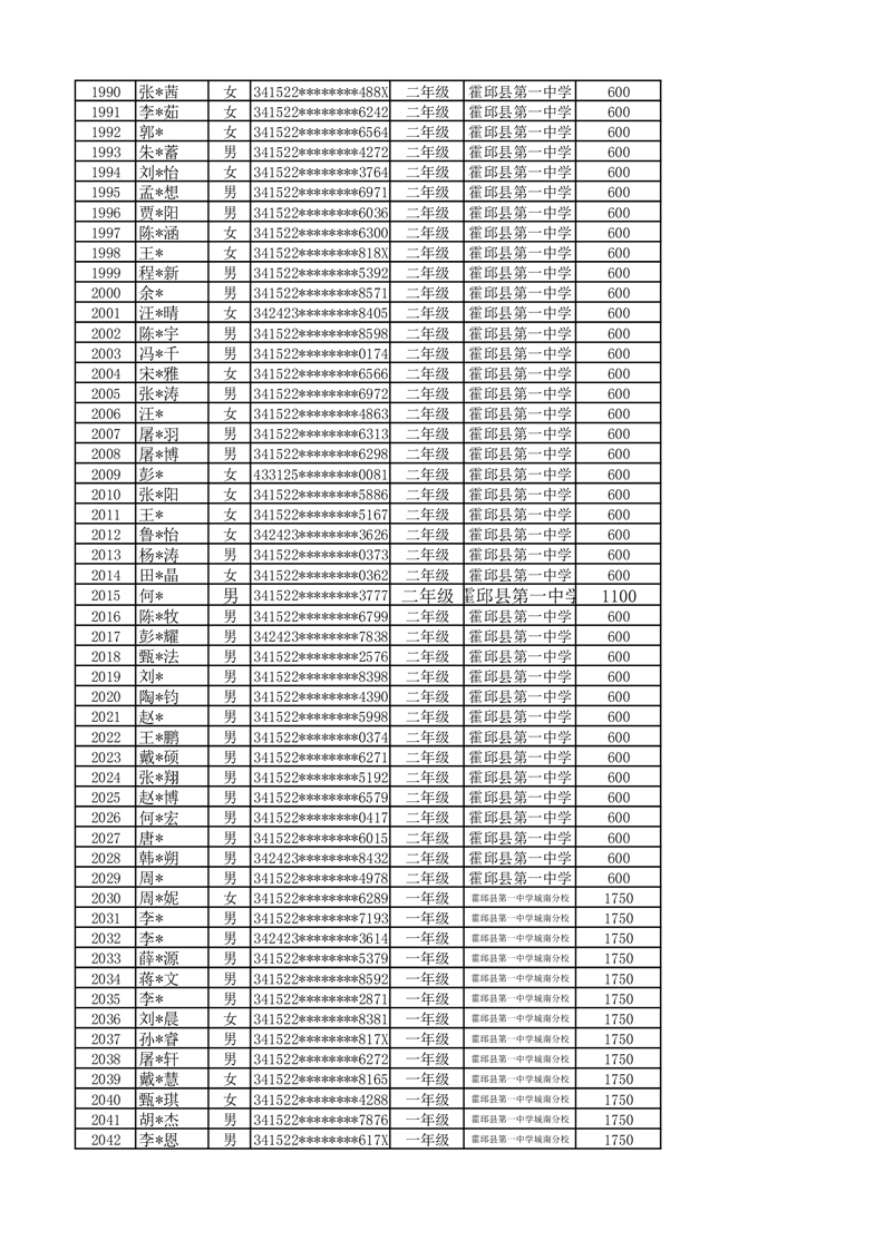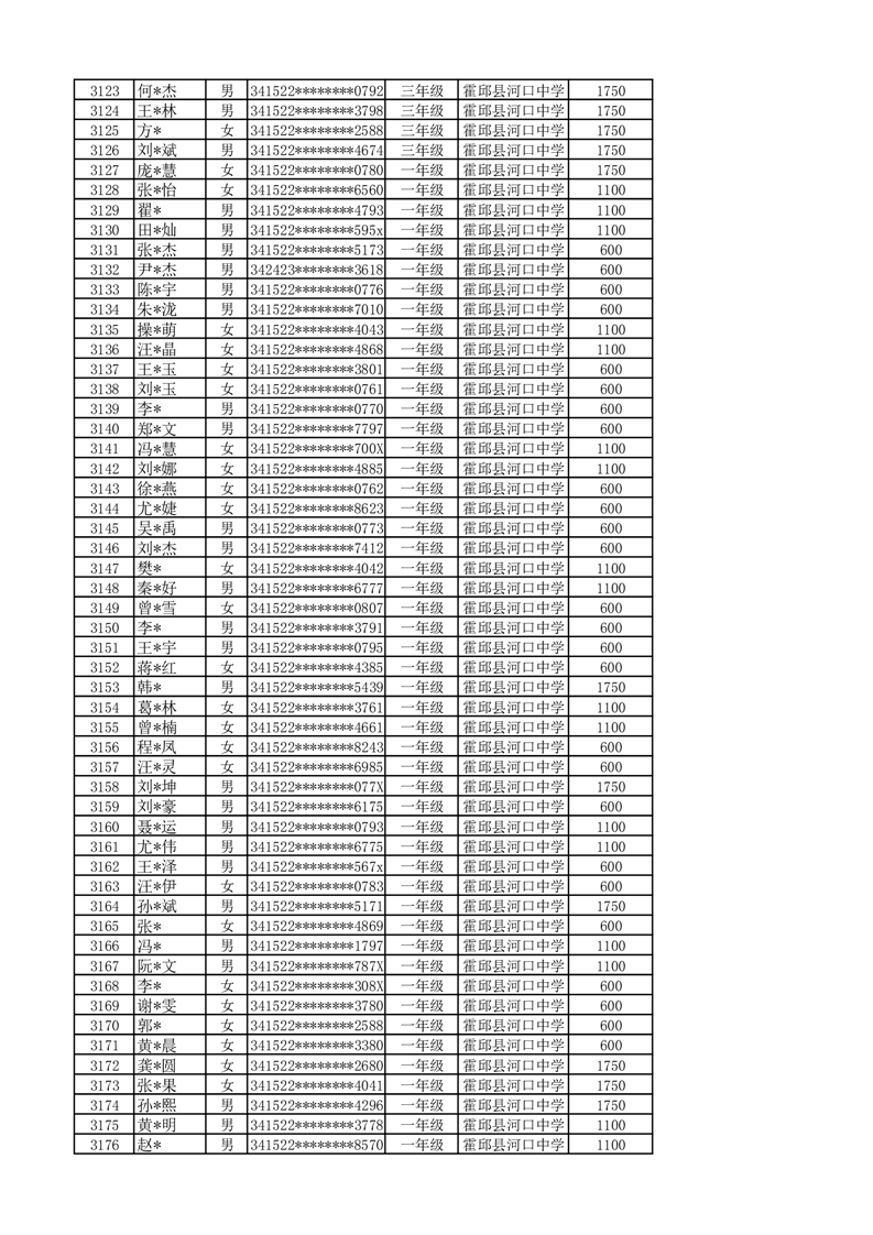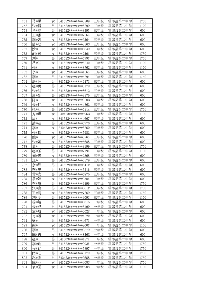 霍邱县2025年秋学期普通高中国家助学金资助名单公示(5177人)