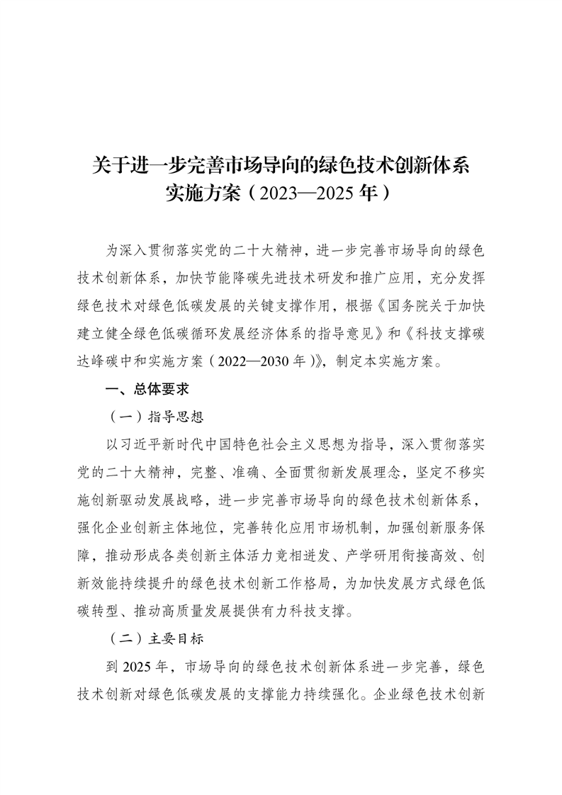 关于进一步完善市场导向的绿色技术创新体系实施方案(2023—2025年)
