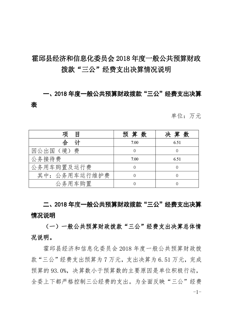 霍邱县经信委2018年度一般公共预算财政拨款“三公”经费支出决算情况说明