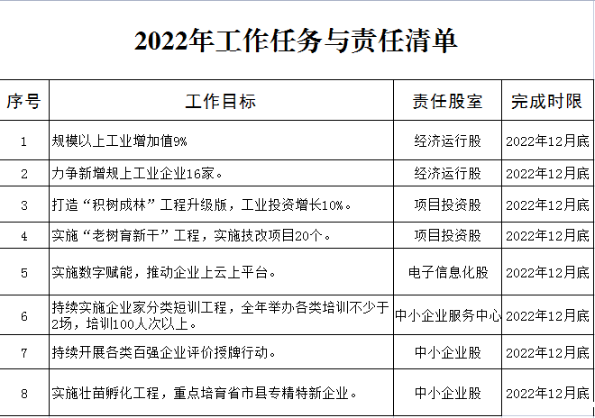 霍邱县经济和信息化局2022年重点任务与责任清单