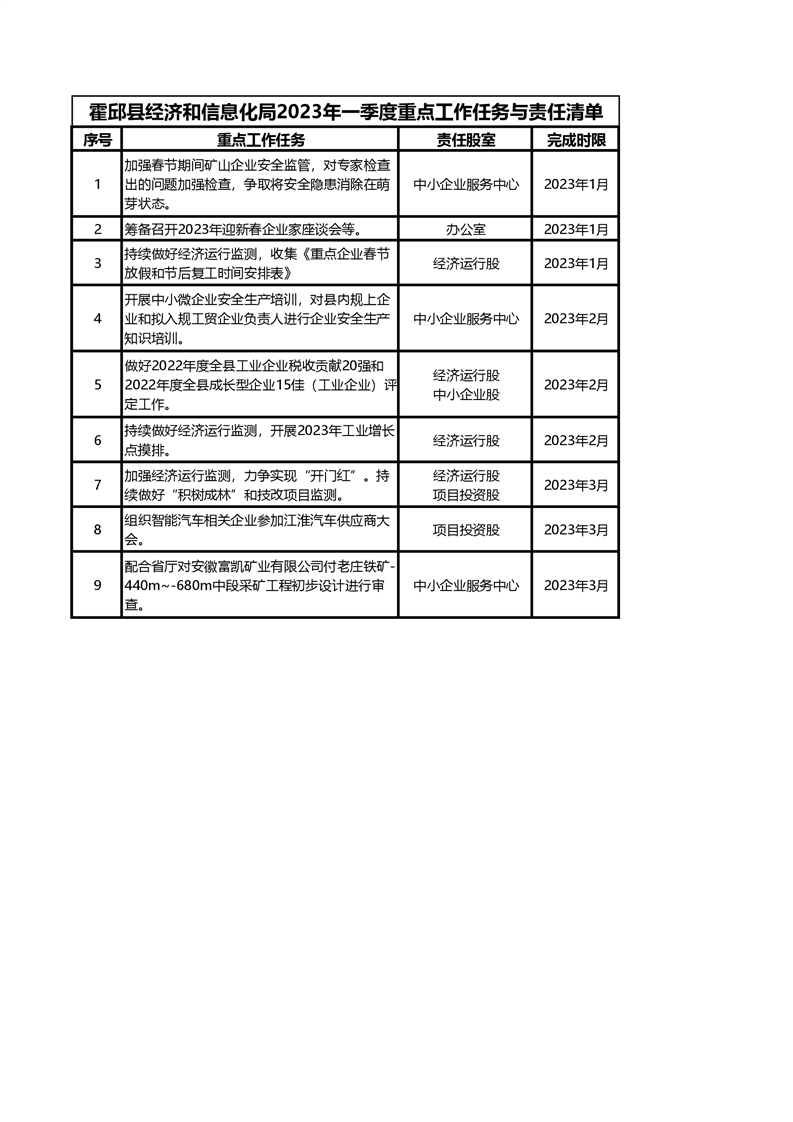 霍邱县经济和信息化局2023年第一季度重点工作任务及责任清单