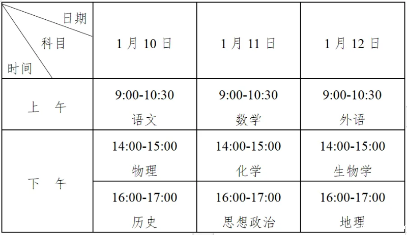 我省2025年普通高中学业水平合格性考试笔试时间为1月10日-1月12日(具体各科目考试时间安排见下表),信息技术和通用技术(合卷)计算机化考试时间为1月13日-1月16日(各地在此考试时段内组织安排考生参加考试)。考生应仔细阅读准考证上的相关信息,提前了解自己所在的考点、考场以及各科目具体考试时间,提前熟悉考点位置(如考点学校有多个校区,要提前了解下自己所在考点在哪个校区),及时关注考试期间天气情况及考点周边交通情况,合理安排出行时间和线路,避免因天气和交通等原因造成延误考试。