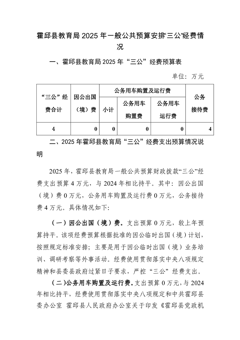 霍邱县教育局2025年单位一般公共预算安排“三公”经费情况公开