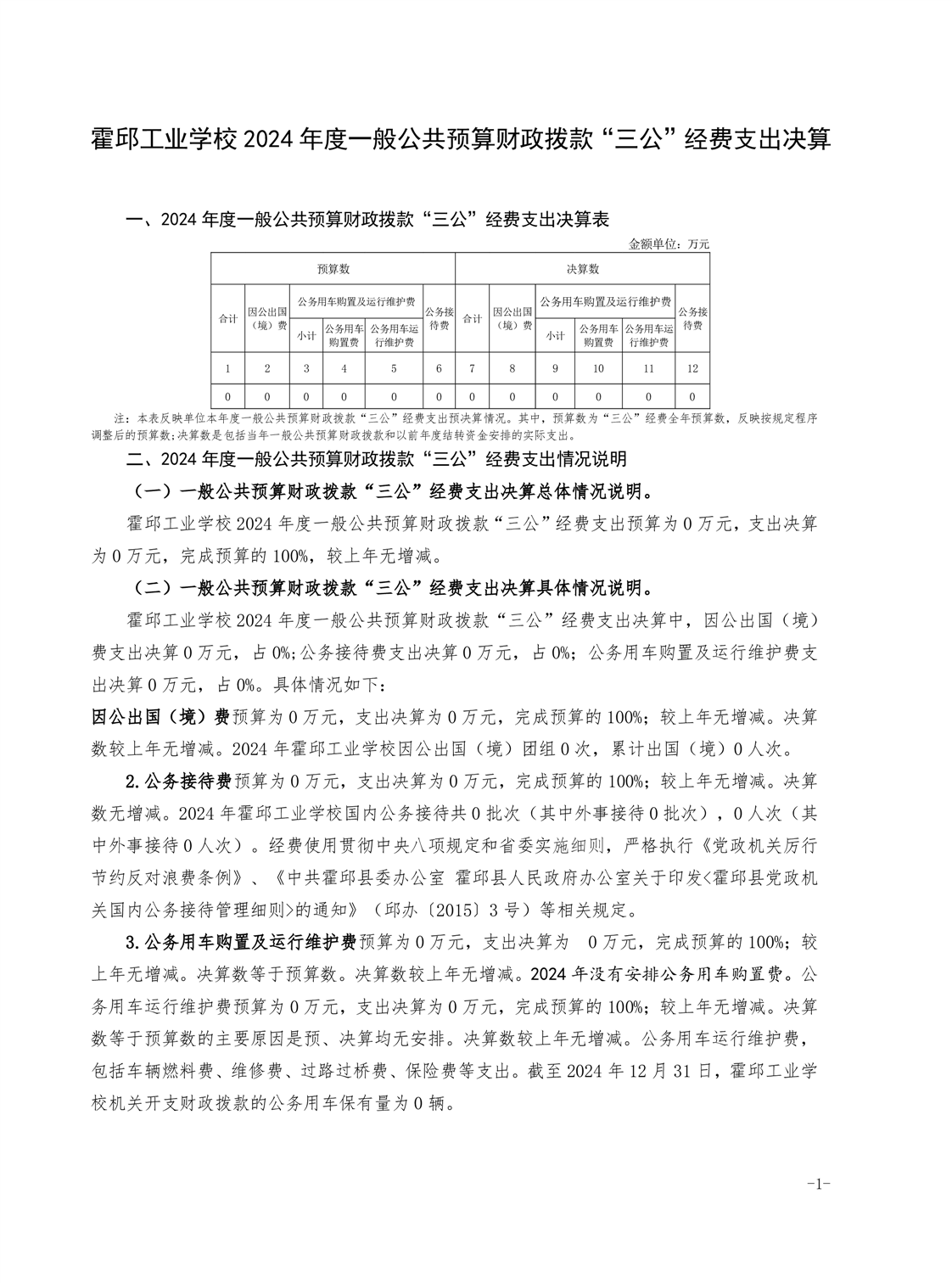 霍邱工业学校 2024 年度一般公共预算财政拨款“三公”经费支出决算