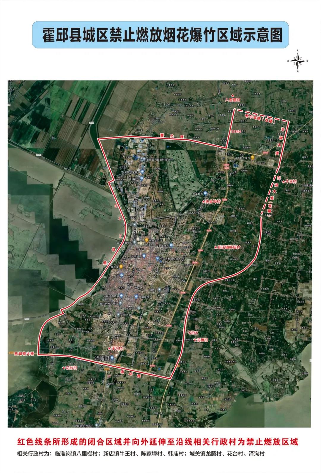 第二条 霍邱县城区禁止燃放烟花爆竹区域为:“蓼北路——S343——哈尔滨路——东湖大道——S245(南外环路交汇点)——南外环路——城西湖特大桥东——X032(沿岗河堤)”所合围区域并向外延伸至沿线临淮岗镇八里棚村;新店镇牛王村、陈家埠村、韩庙村;城关镇龙腾村、花台村、泽沟村。