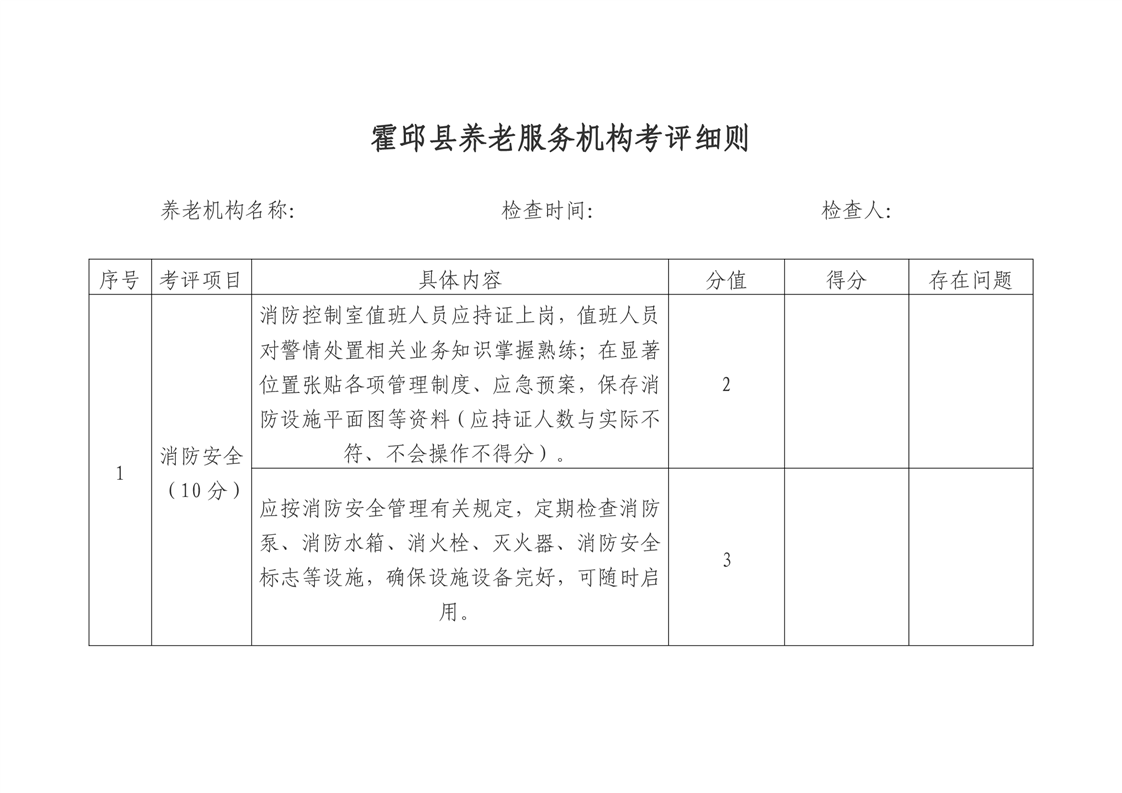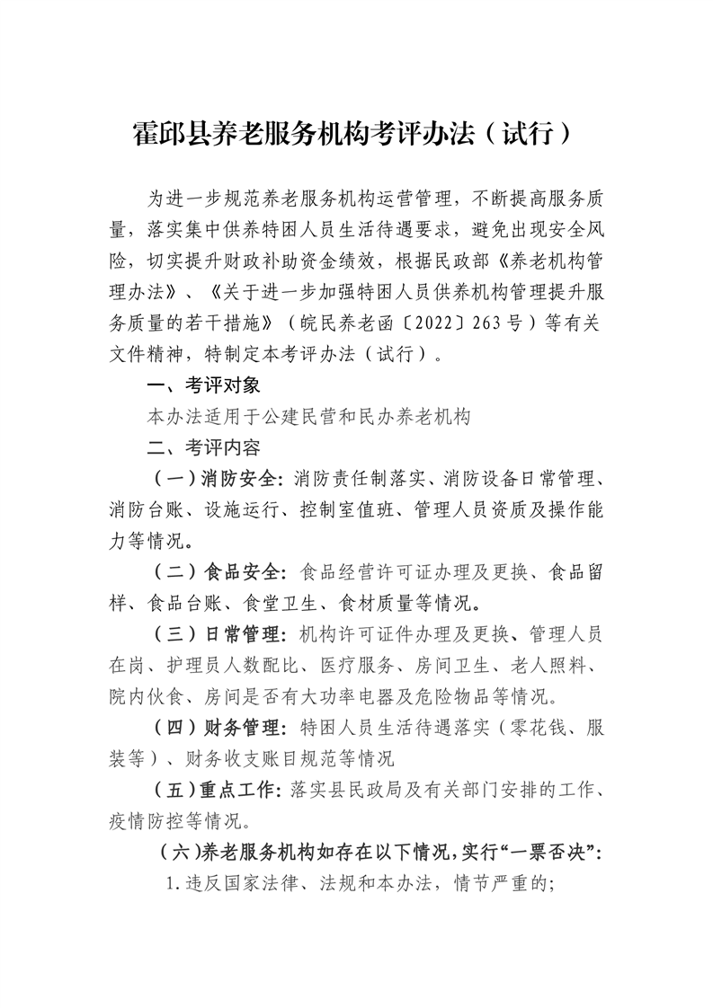 霍邱县民政局关于印发《霍邱县养老服务机构考评办法(试行)》的通知