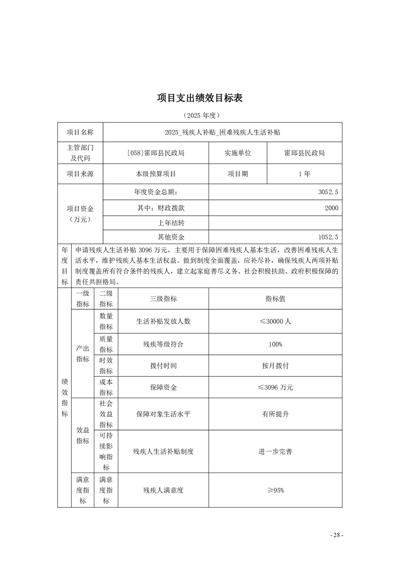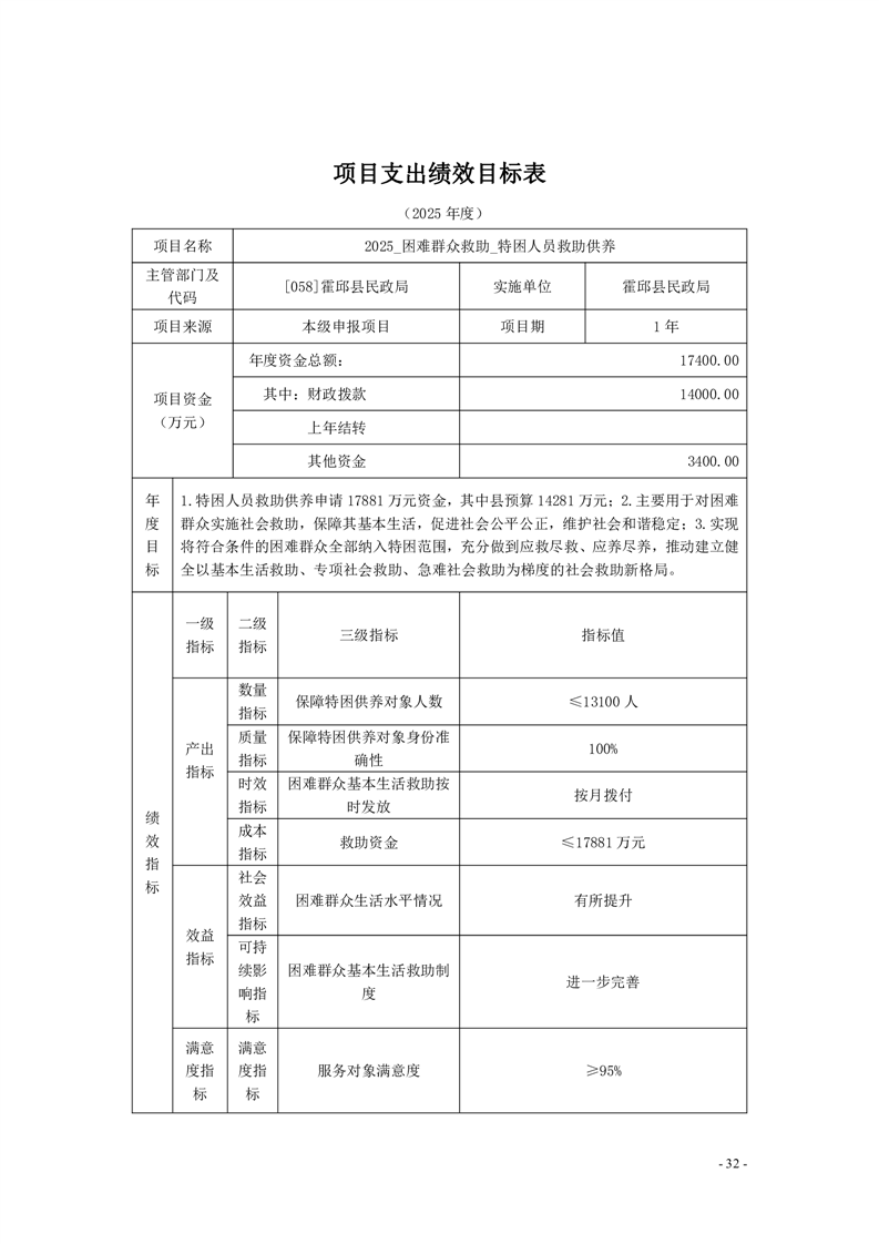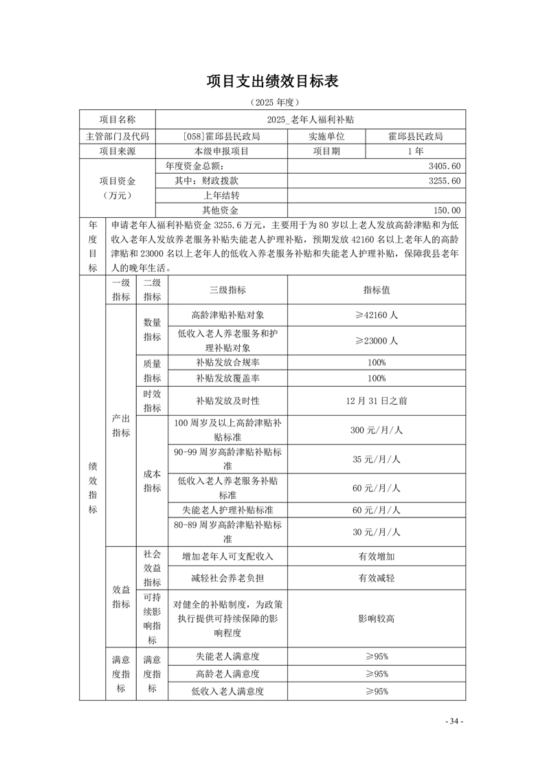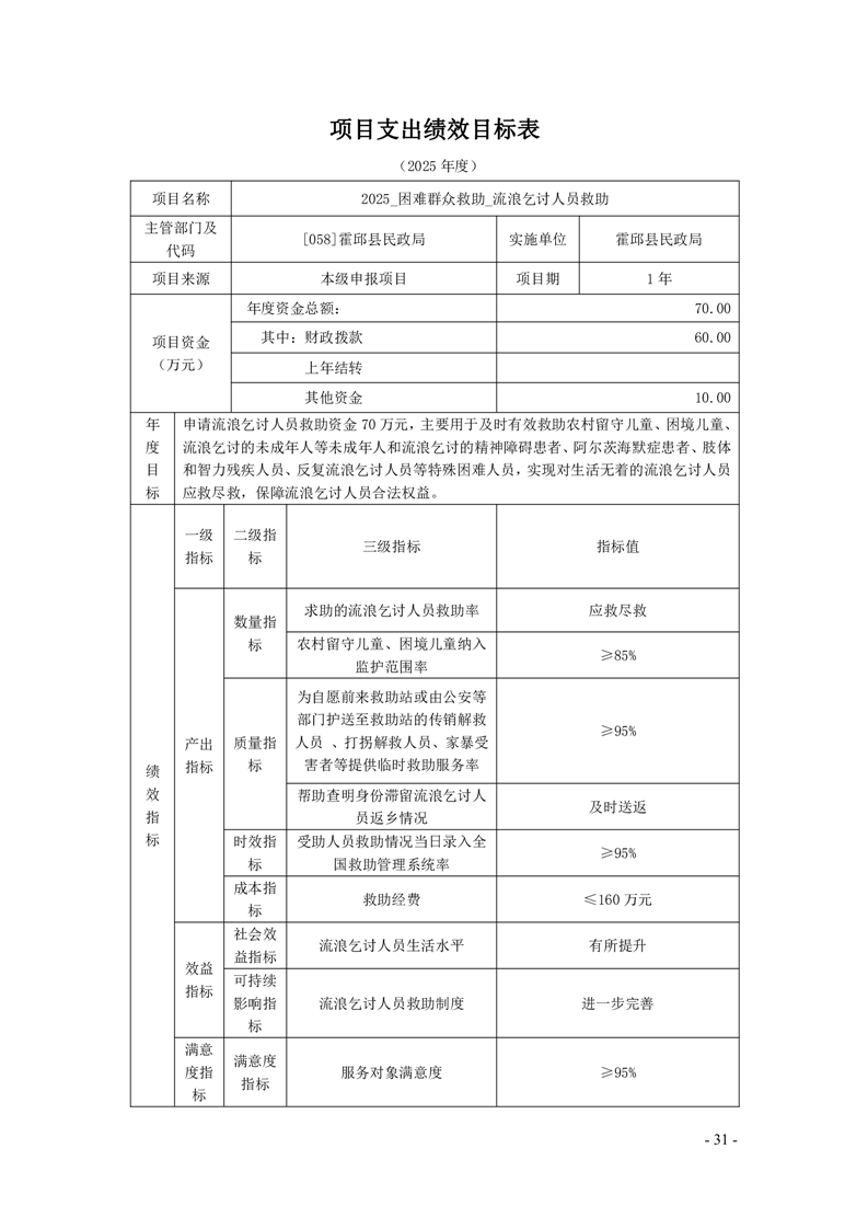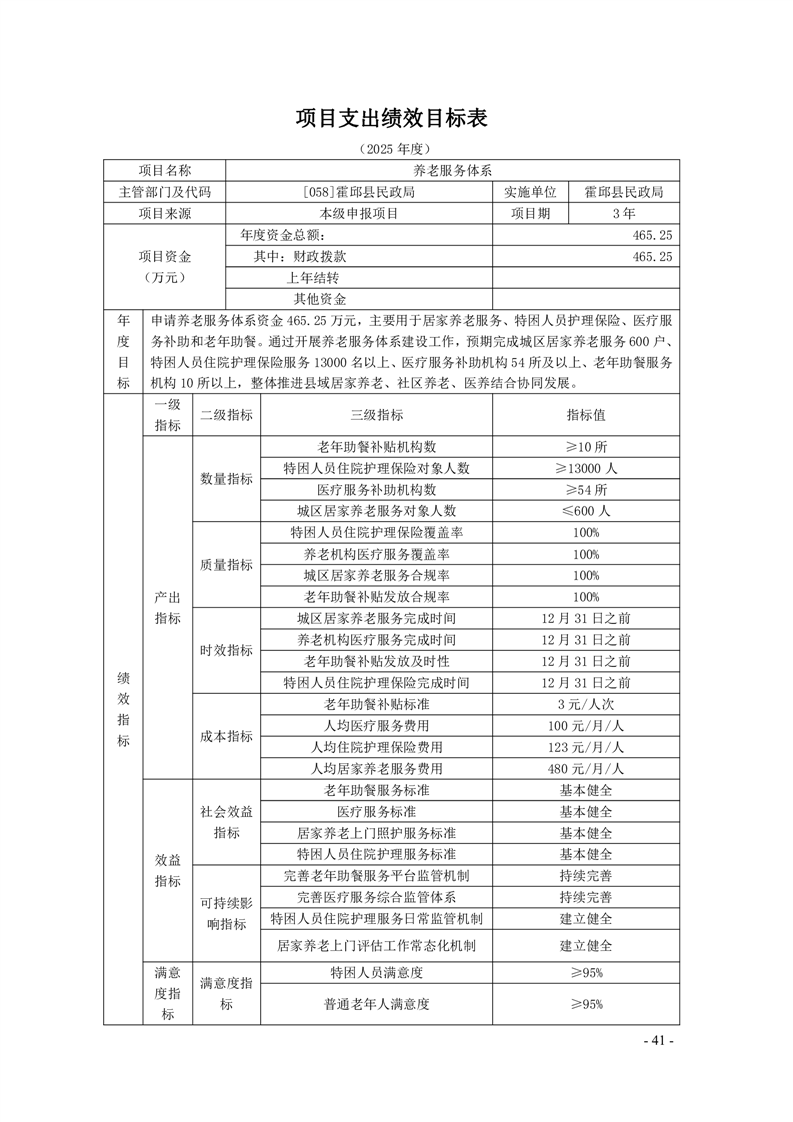 霍邱县民政局2025年部门项目支出绩效目标表