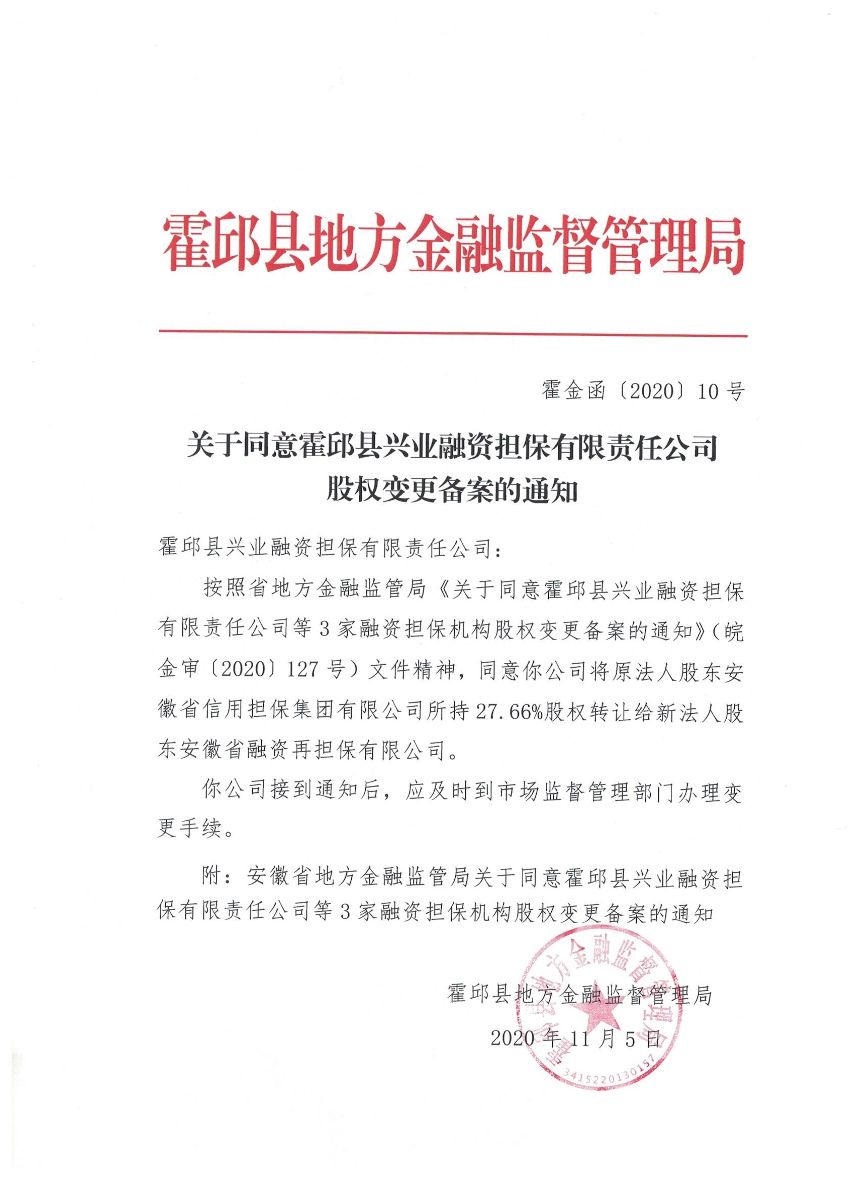 关于同意霍邱县兴业融资担保有限责任公司股权变更备案的通知