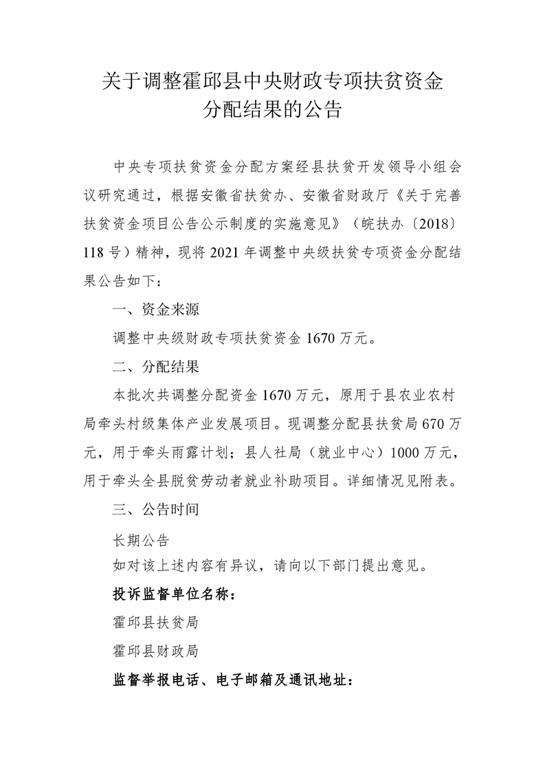 关于霍邱县中央财政专项扶贫资金分配结果的公告7672