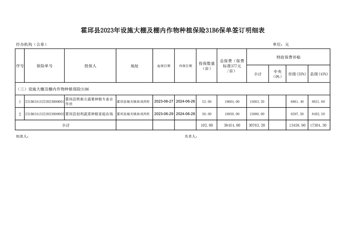 霍邱县2023年4-6月大棚蔬菜投保明细表