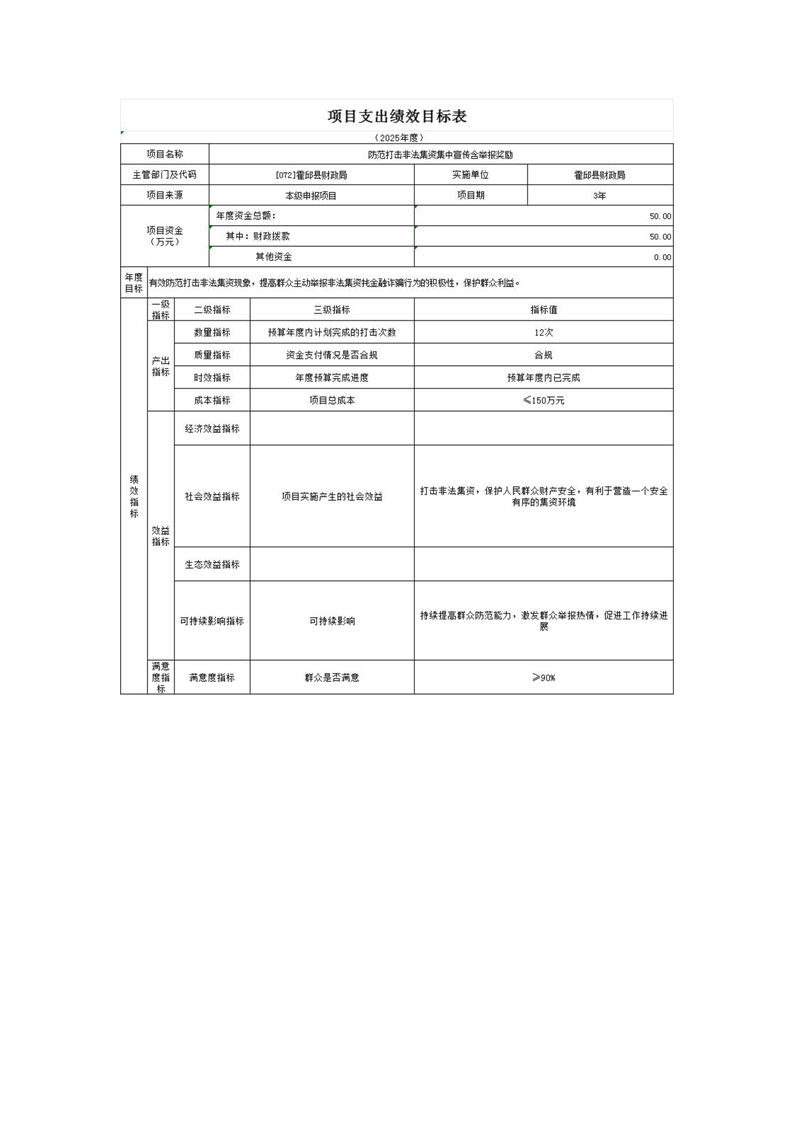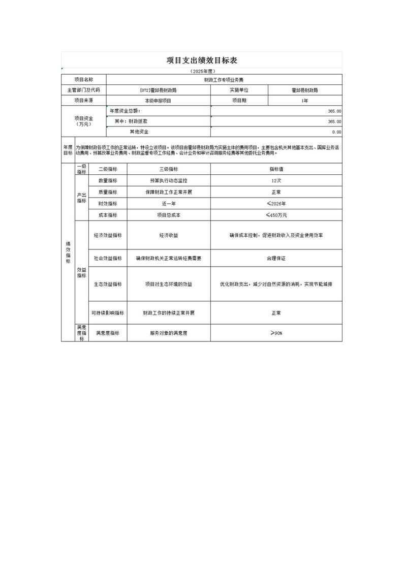 2025年霍邱县财政局部门项目支出绩效目标公开