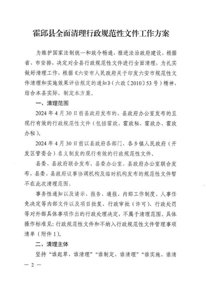 现将《霍邱县全面清理行政规范性文件工作方案》印发给你们,请认真贯彻执行。