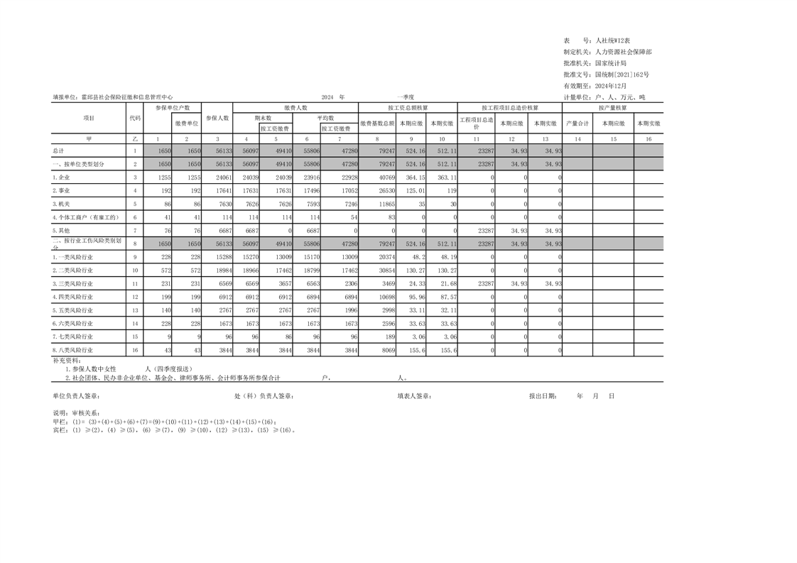 霍邱县人力资源和社会保障局2024年第一季度工伤保险参保统计表