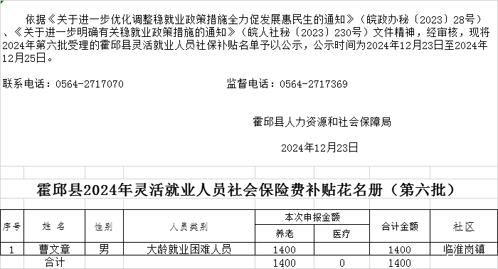 霍邱县2024年灵活就业人员社会保险费补贴(第六批)公示