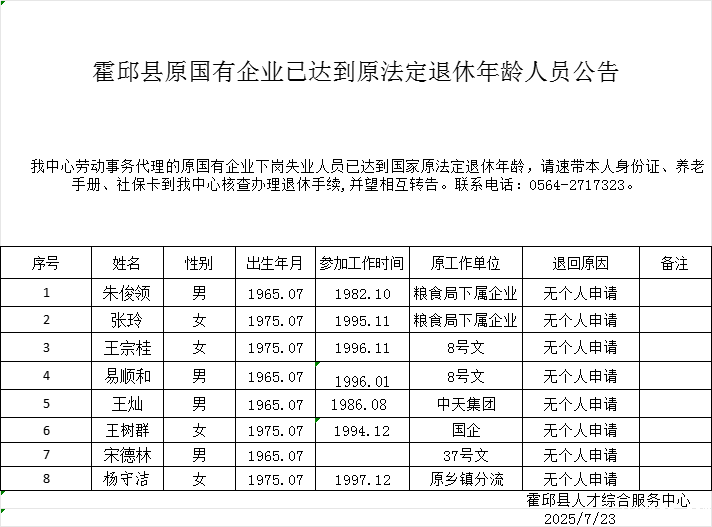 霍邱县原国有企业已达到原法定退休年龄人员公告