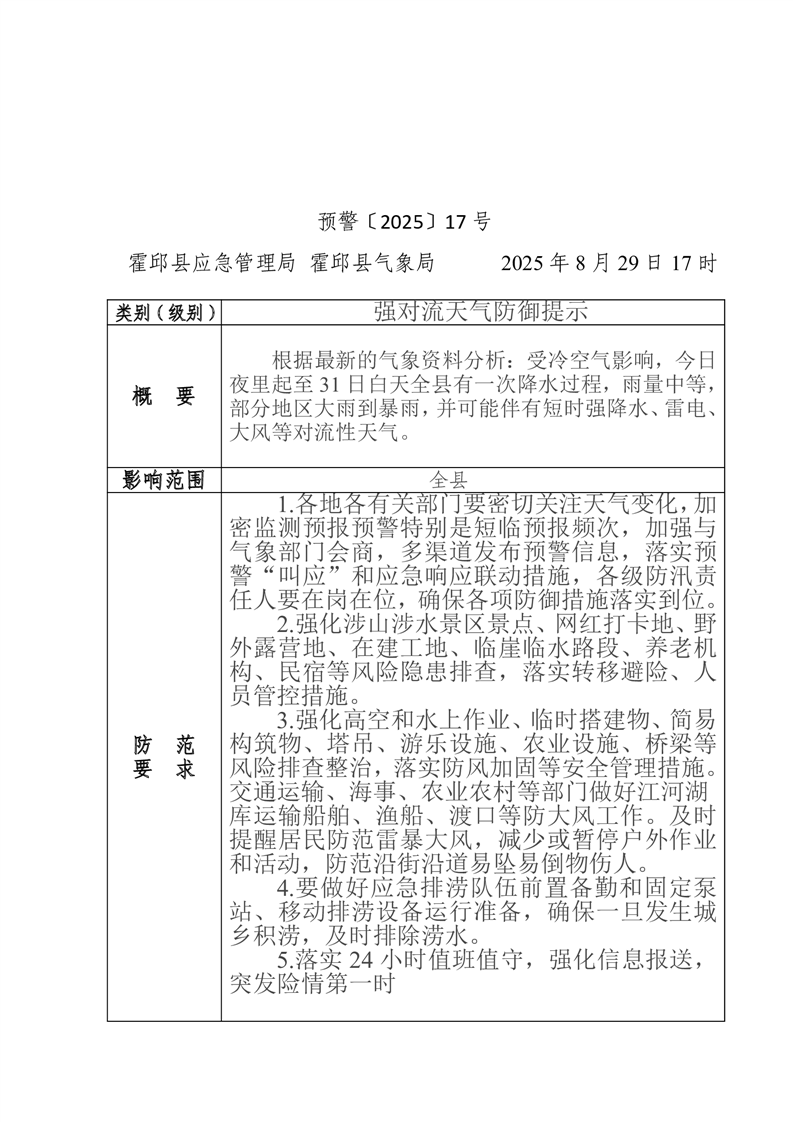 霍邱县气象灾害防御提示(预警〔2025〕17号)