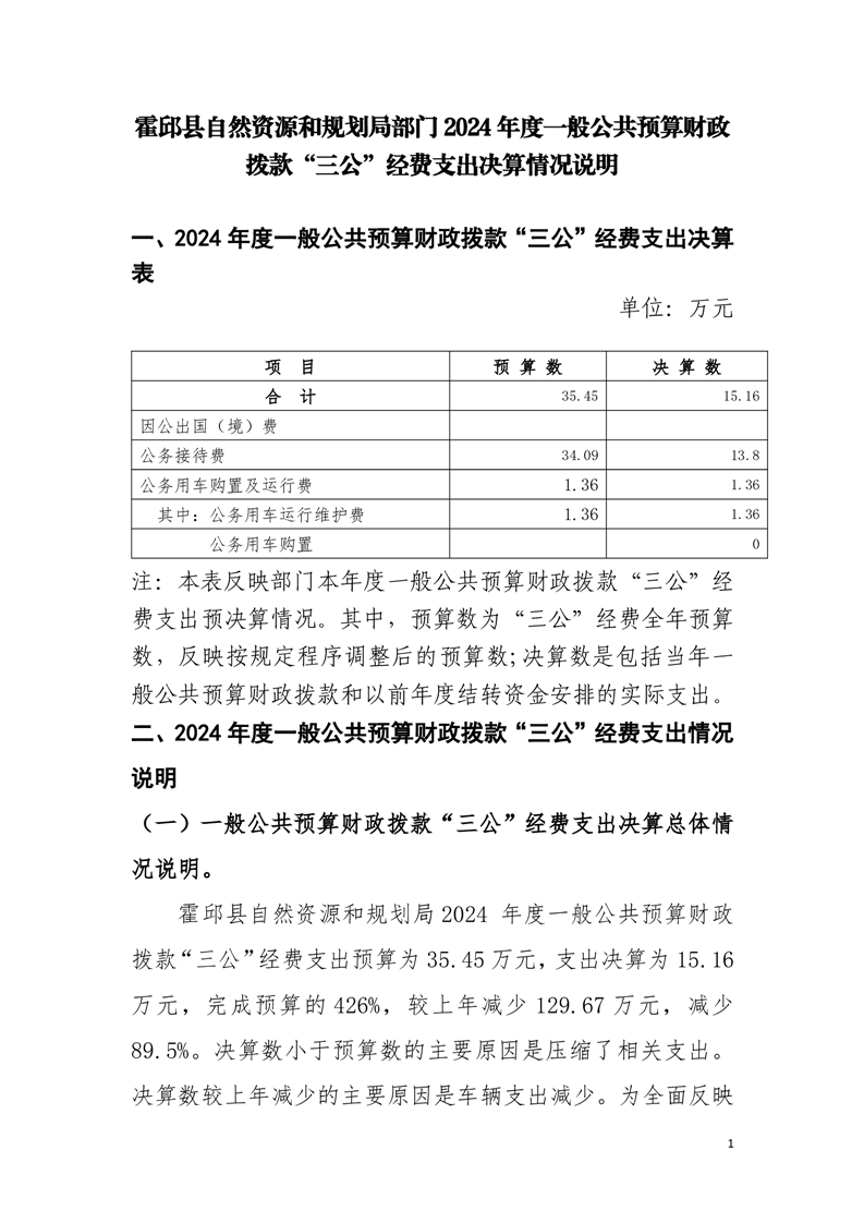 霍邱县自然资源和规划局部门2024年度一般公共预算财政拨款“三公”经费支出决算情况说明