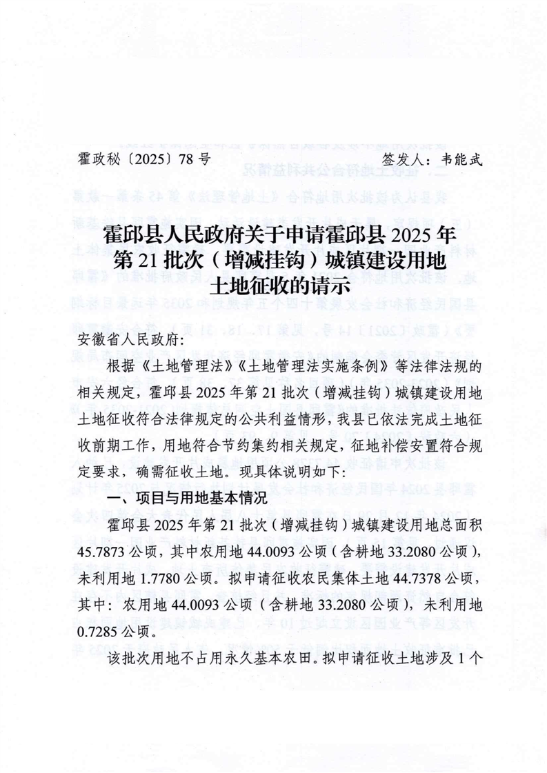 世界杯比赛直播平台关于申请霍邱县2025年第21批次(增减挂钩)城镇建设用地土地征收的请示
