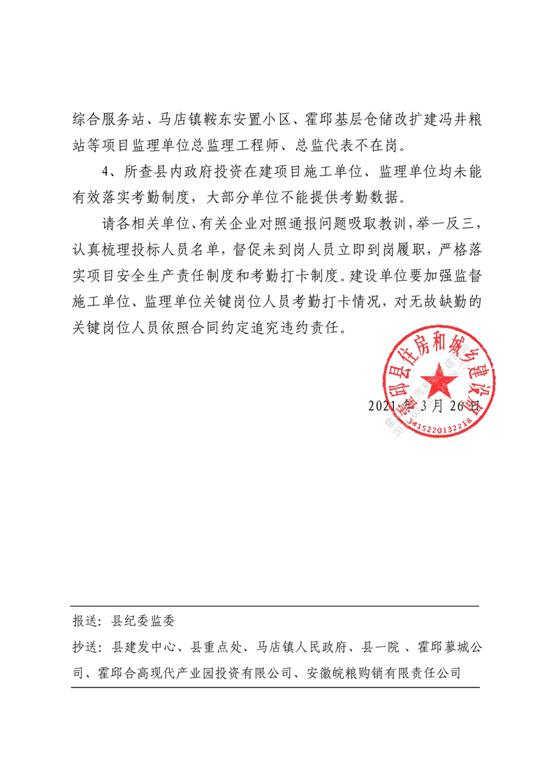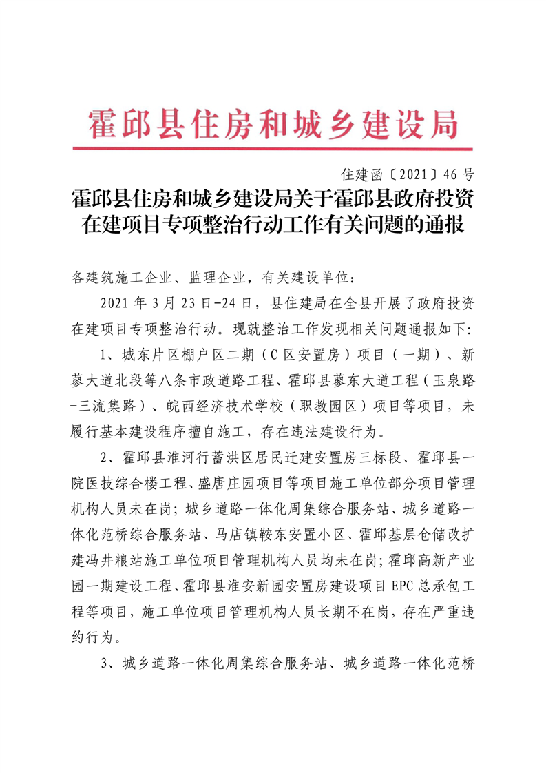 霍邱县住房和城乡建设局关于霍邱县政府投资在建项目专项整治行动工作有关问题的通报