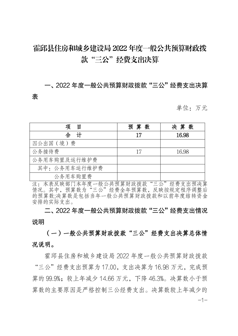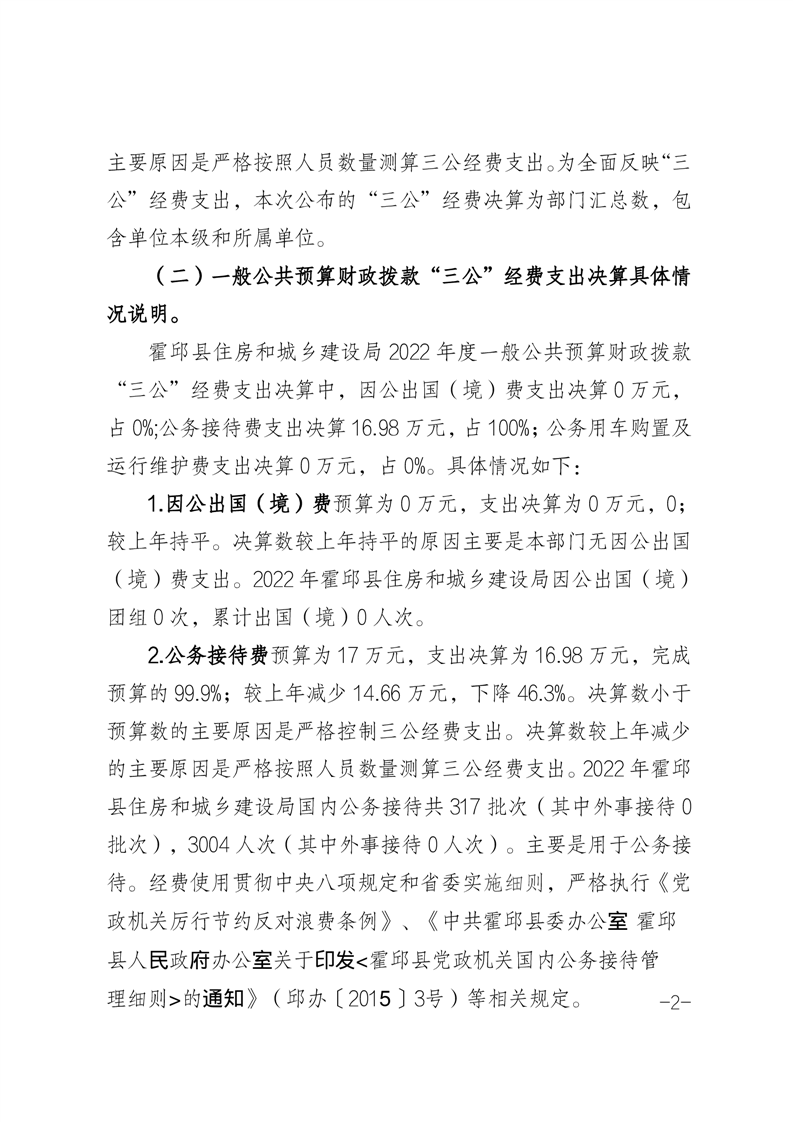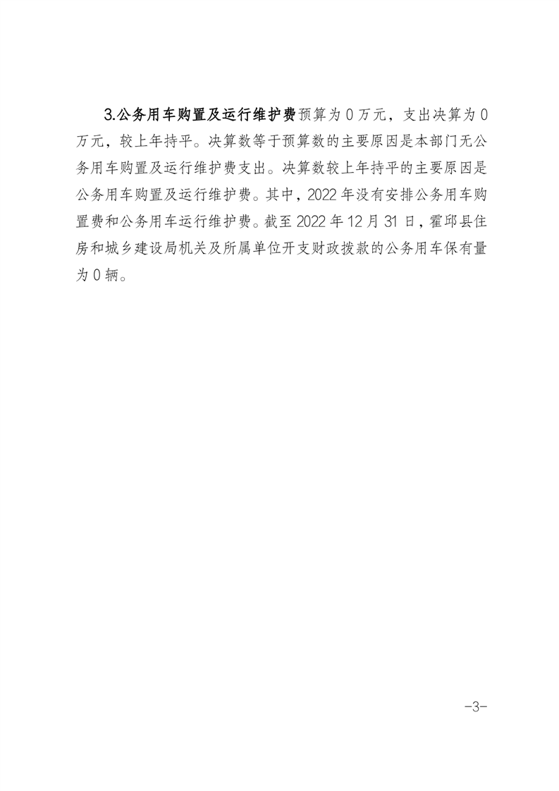 霍邱县住房和城乡建设局2022年一般公共预算财政拨款“三公”经费支出决算公开