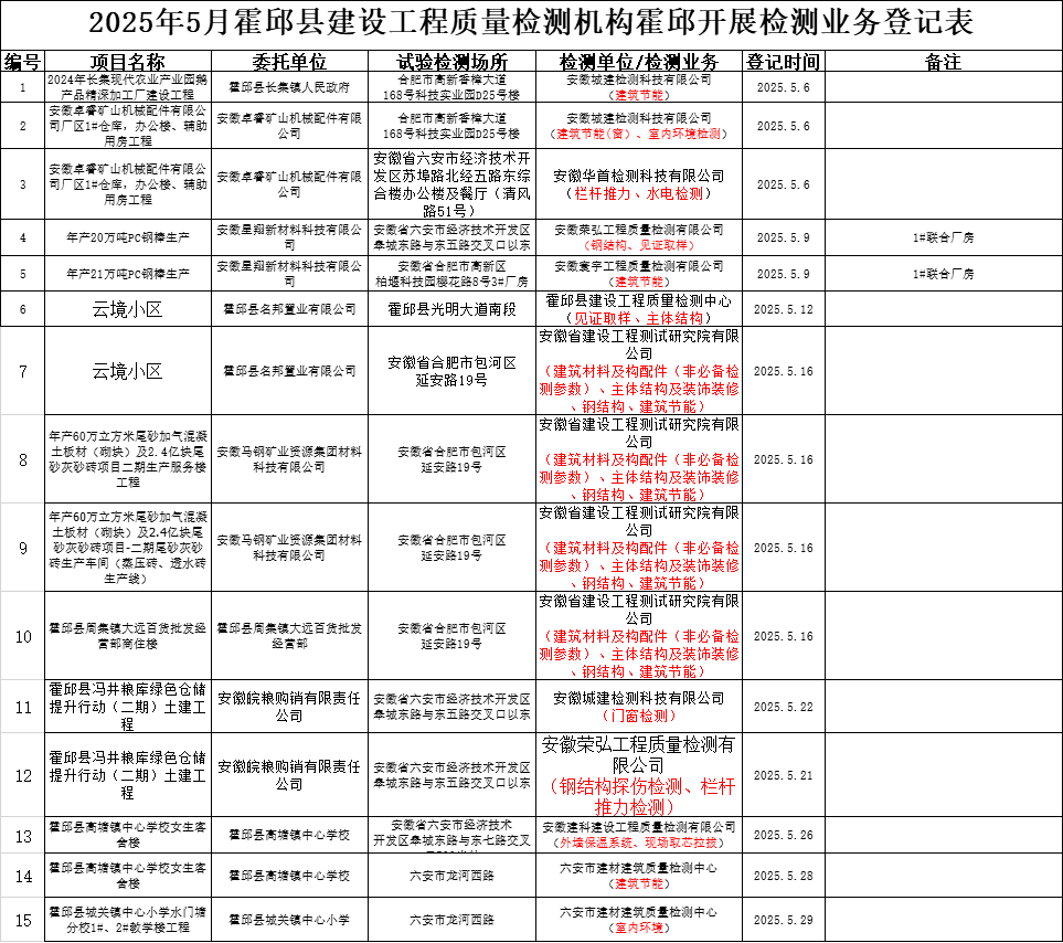 2025年5月县外建设工程质量检测机构进入霍邱开展检测业务登记表