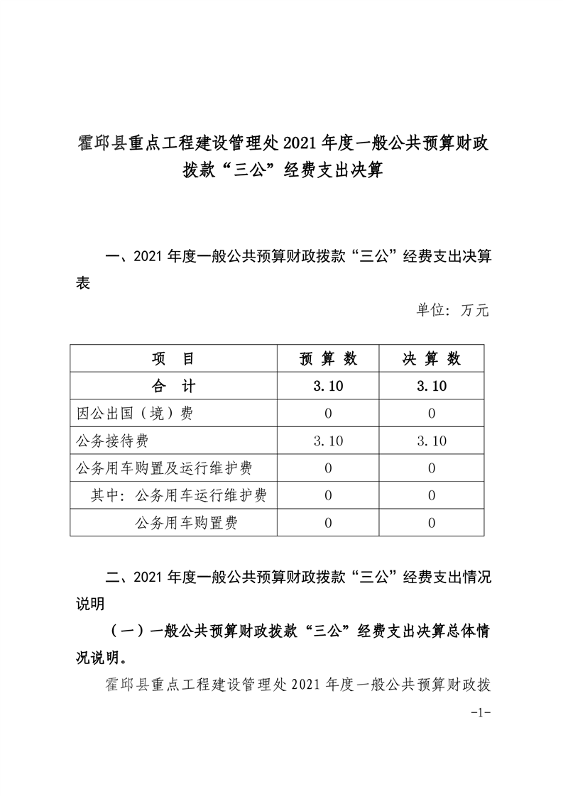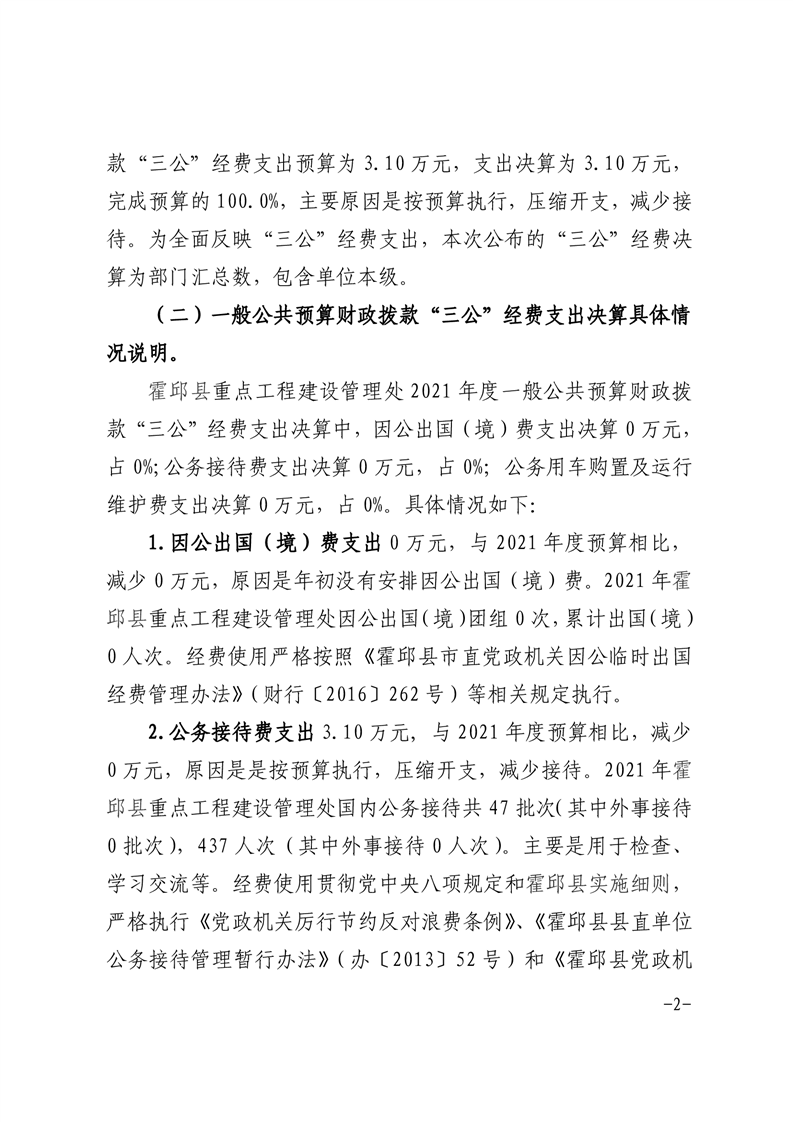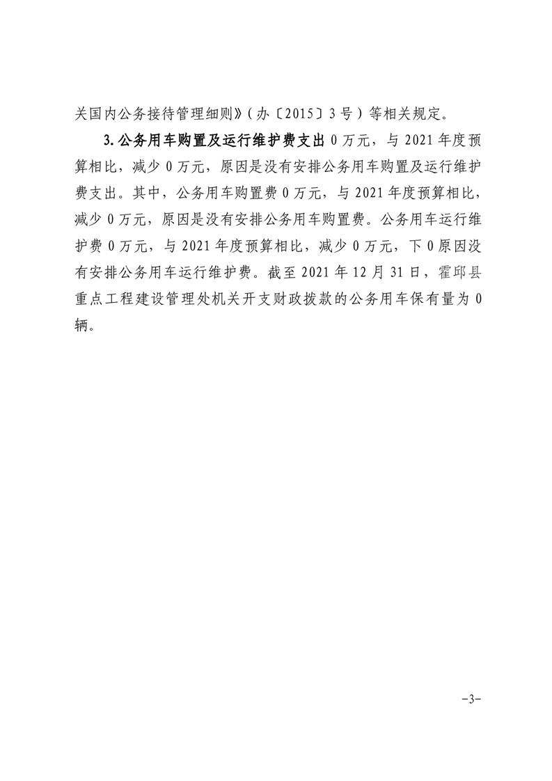 霍邱县重点工程建设管理处2021年度一般公共预算财政拨款“三公”经费支出决算