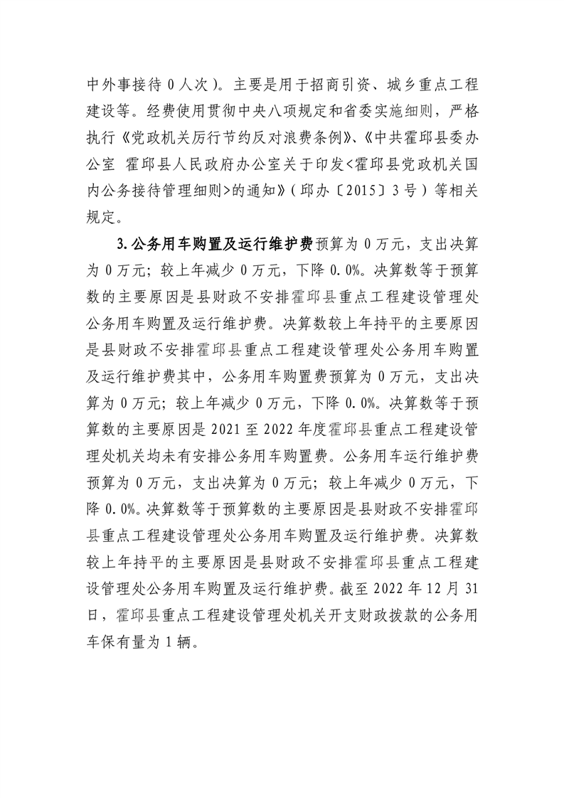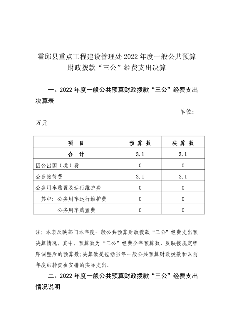 霍邱县重点工程建设管理处2022年度一般公共预算财政拨款“三公”经费支出决算