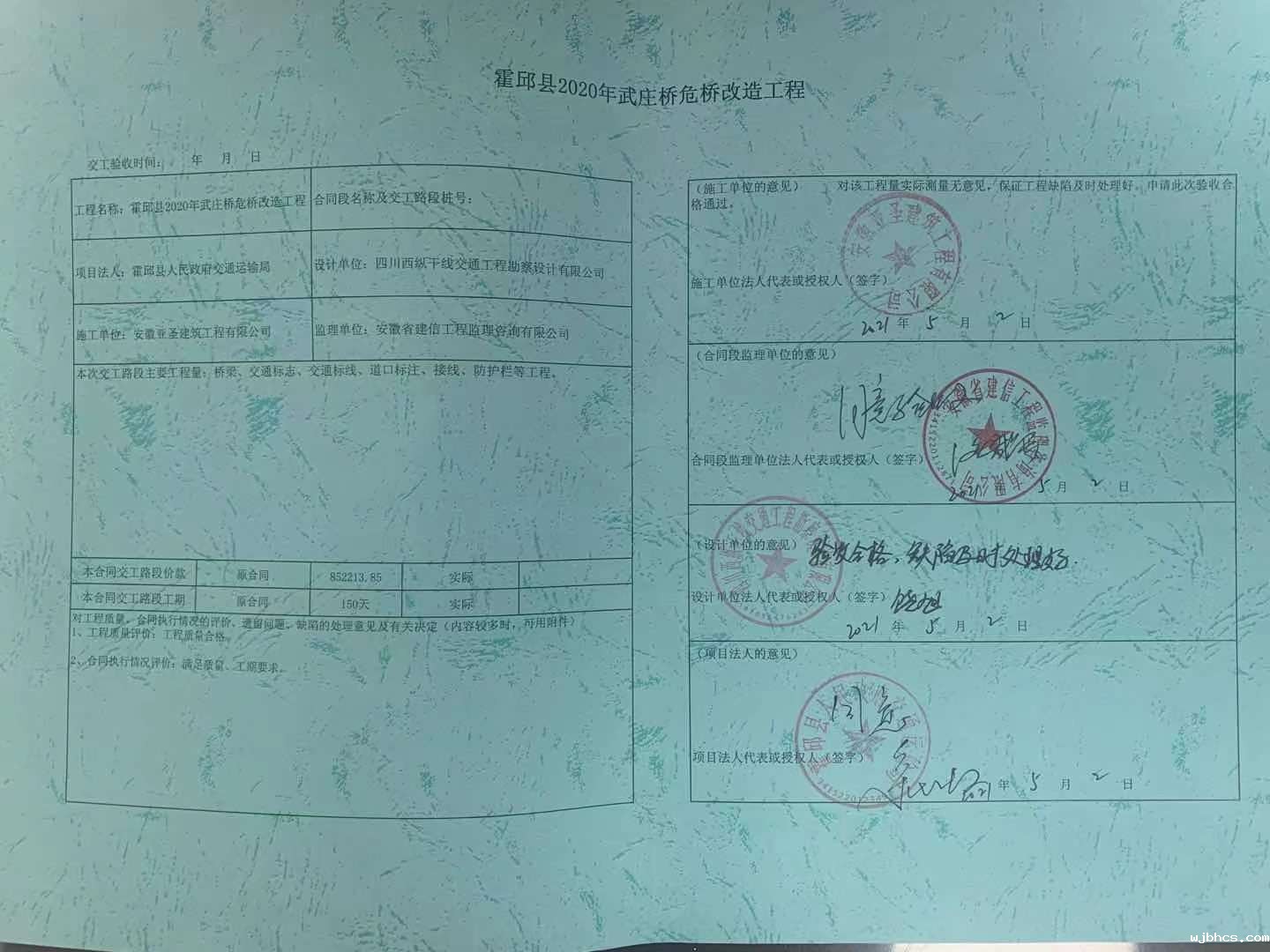 霍邱县2020年武庄桥危桥改造工程验收证书