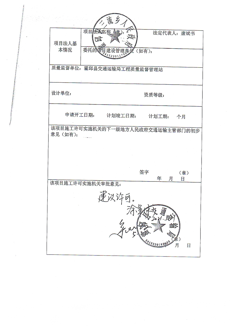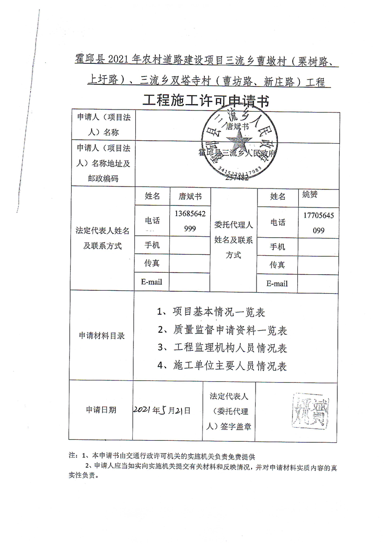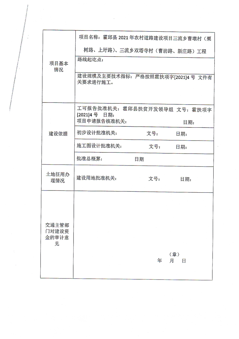 霍邱县2021年三流乡村级道路建设项目许可申请书(曹墩村、双塔寺村)