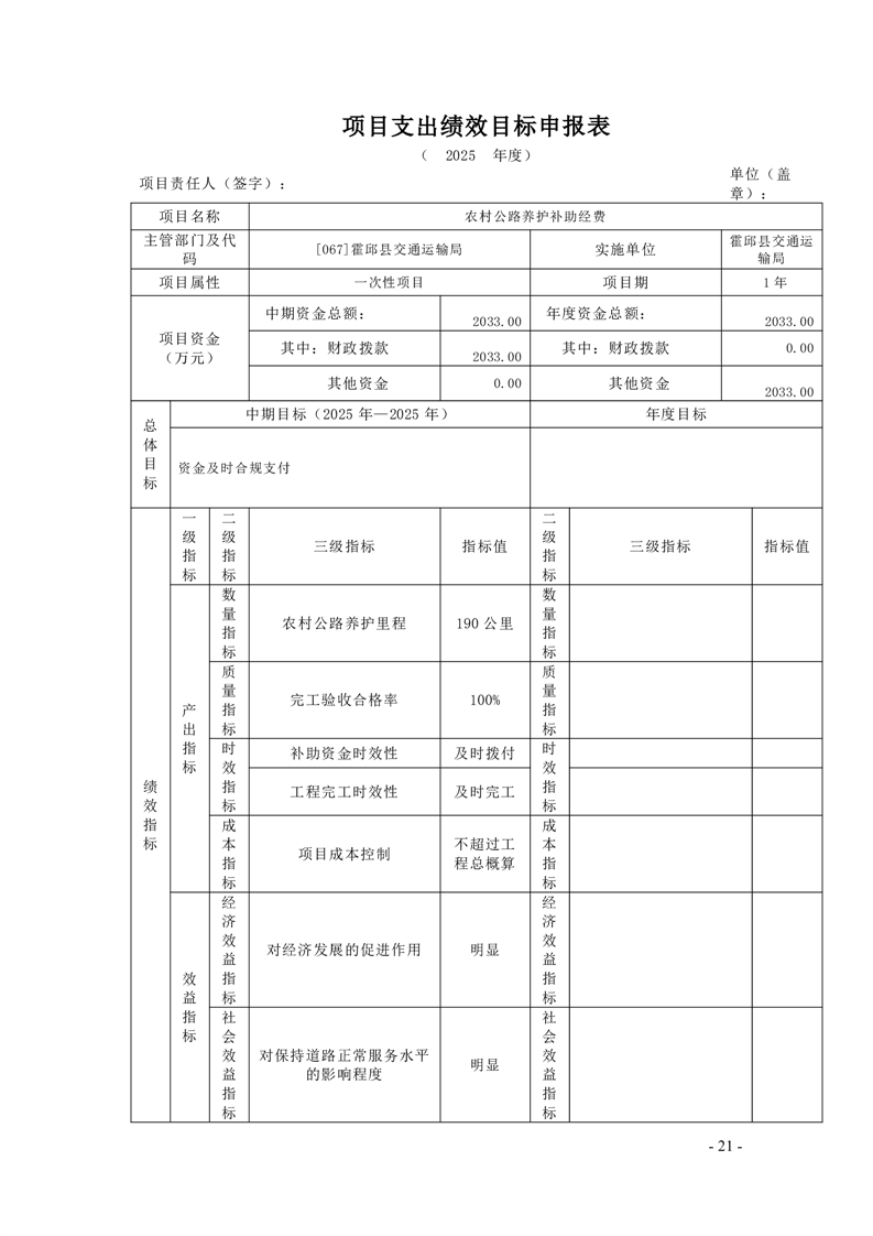 【绩效目标】霍邱县交通运输局2025年项目支出绩效目标申报表