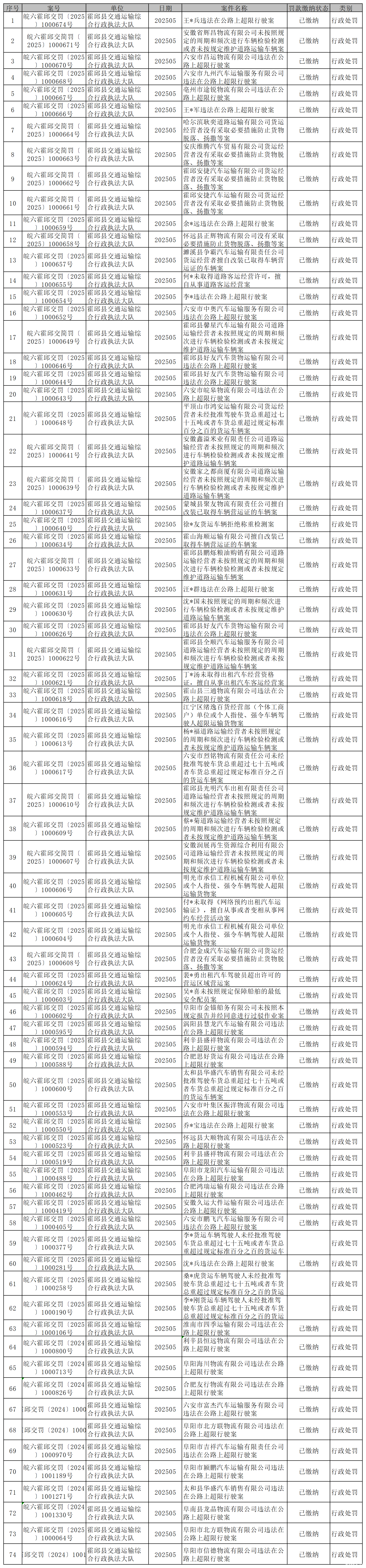 霍邱县交通运输局2025年5月行政执法结果公示