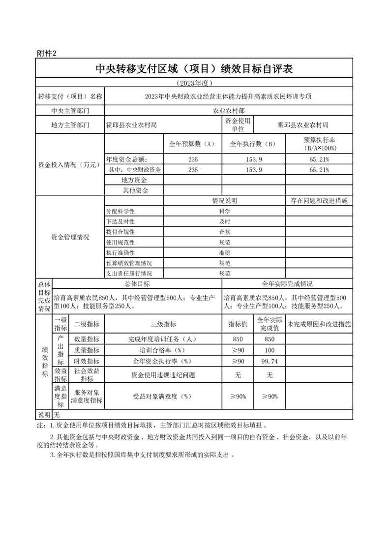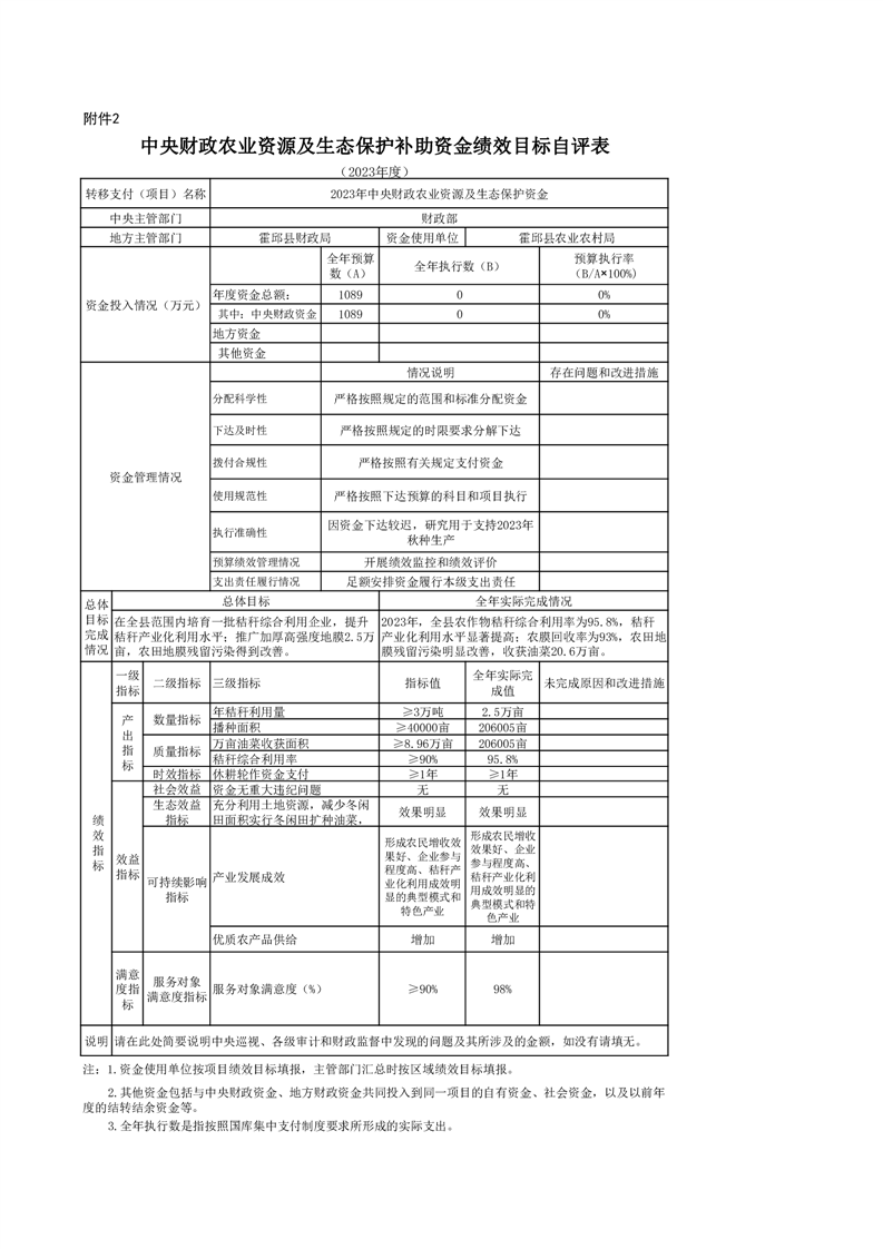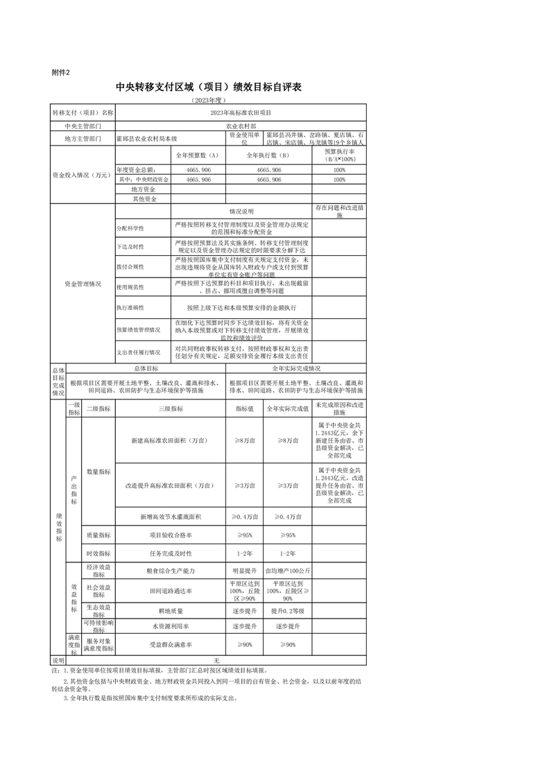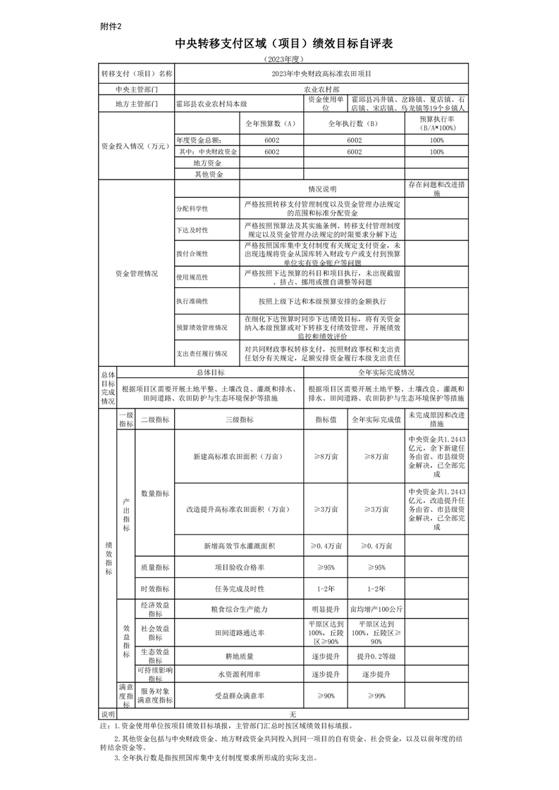 霍邱县农业农村局2023年度中央转移支付区域(项目)绩效目标自评表