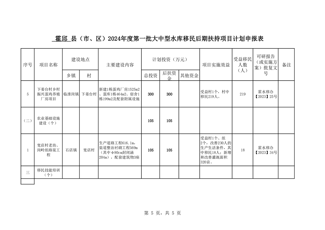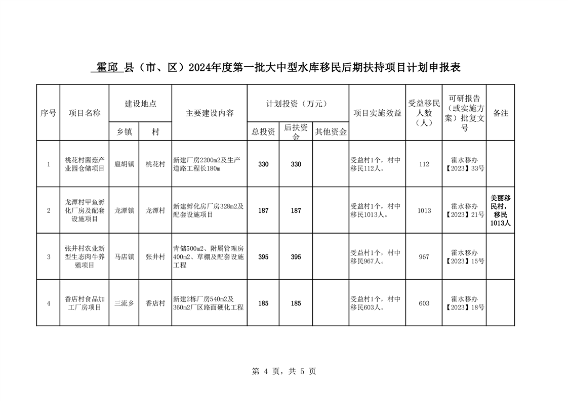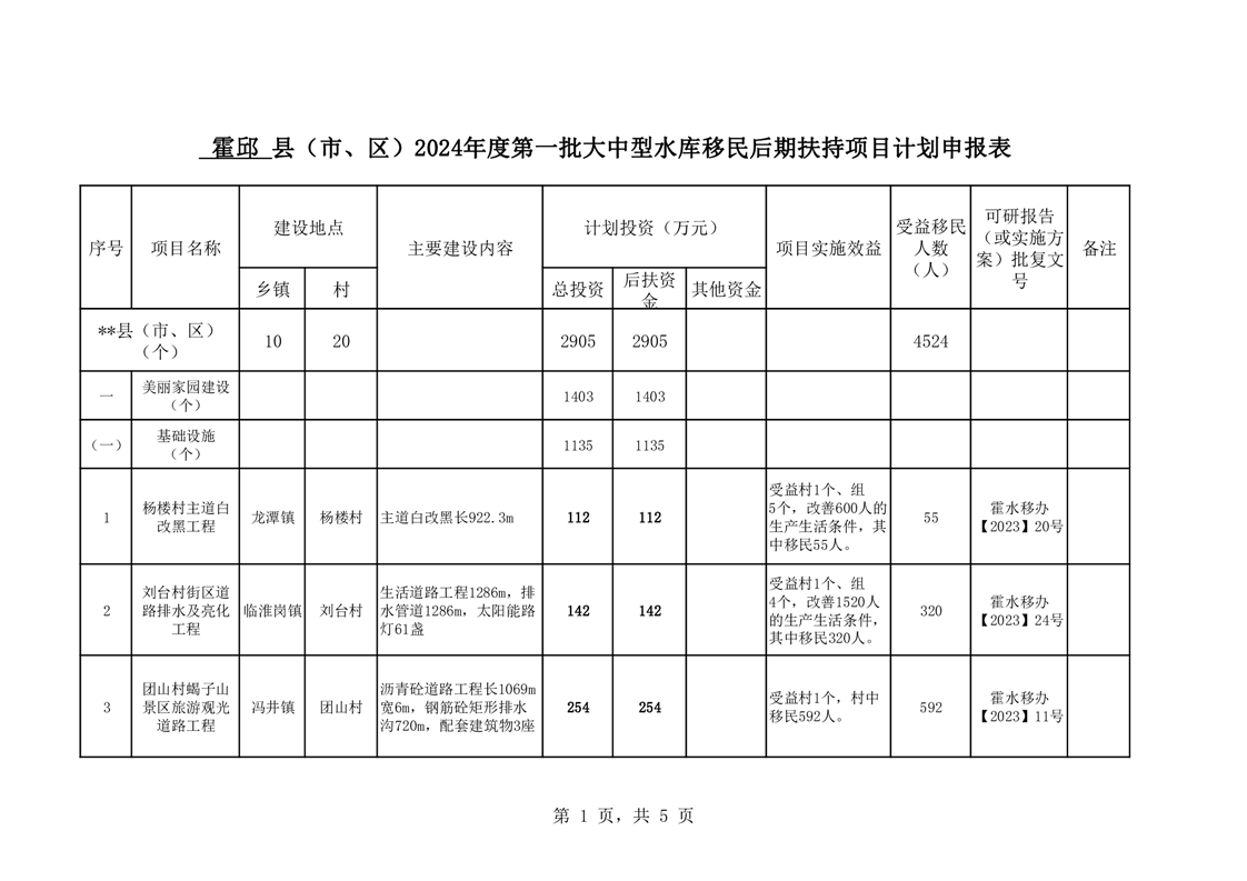 霍邱县2024年度第一批大中型水库移民后期扶持项目计划申报表