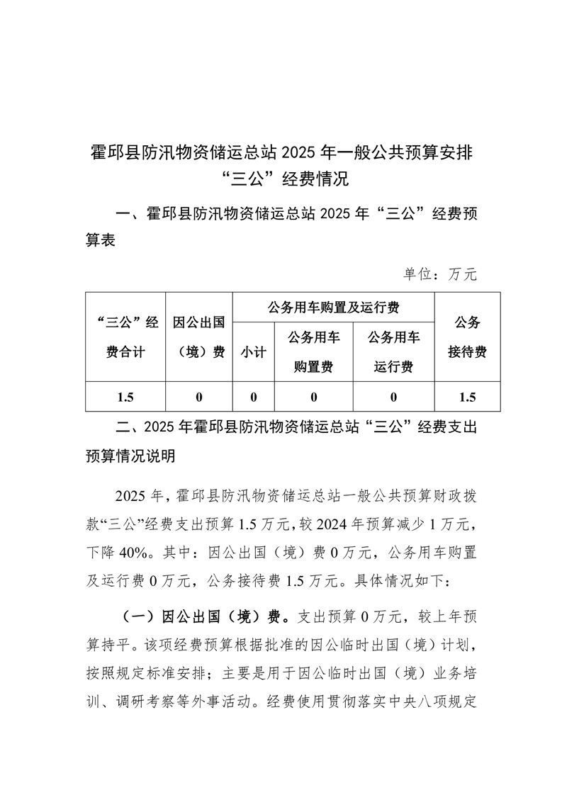 霍邱县防汛物资储运总站2025年一般公共预算安排“三公”经费情况公开