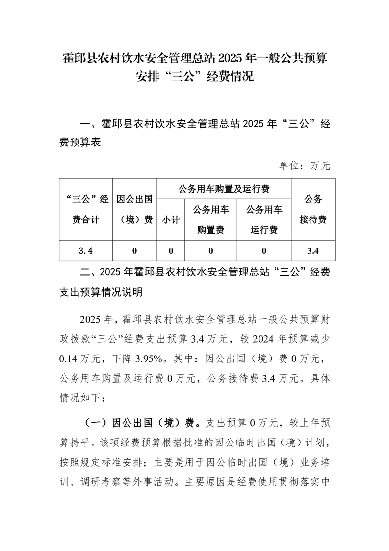 霍邱县农村饮水安全管理总站2025年一般公共预算安排“三公”经费情况公开