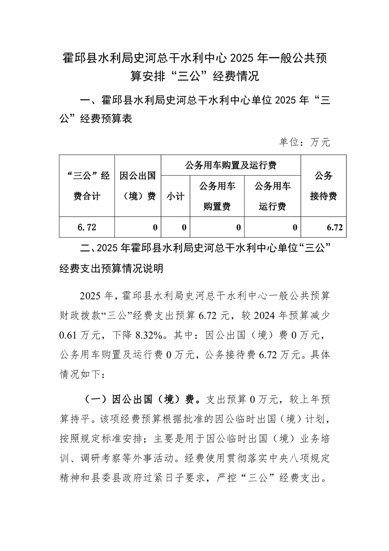 霍邱县水利局史河总干水利中心2025年一般公共预算安排“三公”经费情况公开