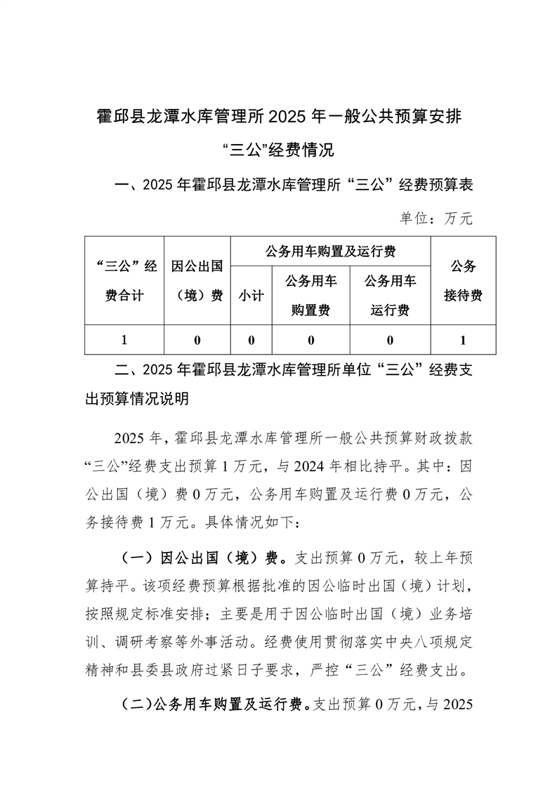 霍邱县龙潭水库管理所2025年一般公共预算安排“三公”经费情况公开