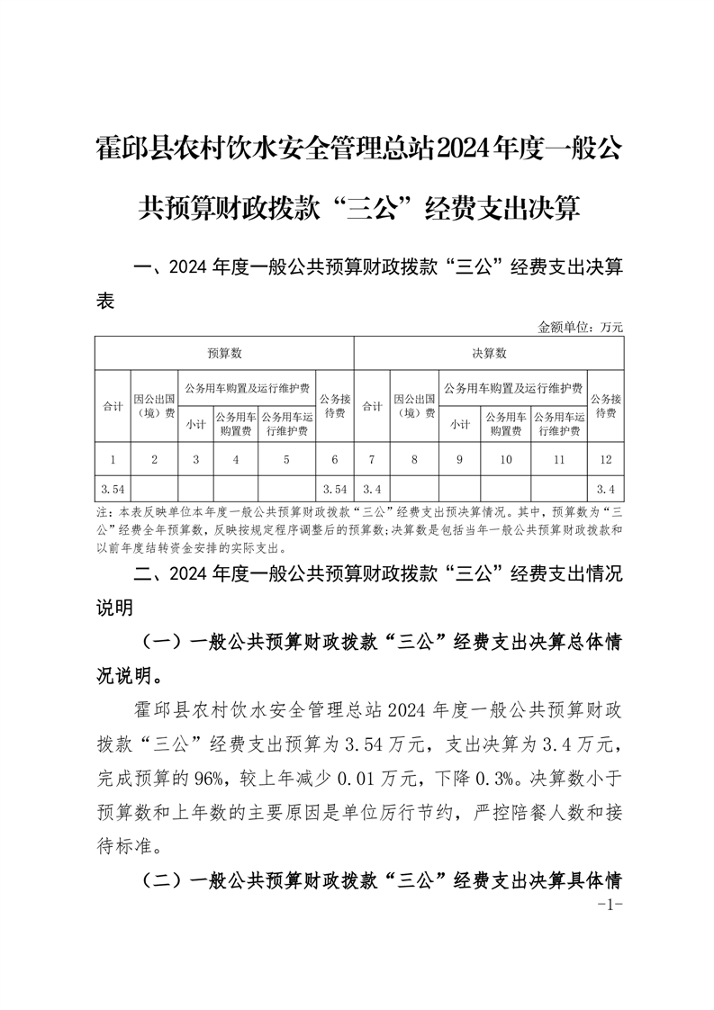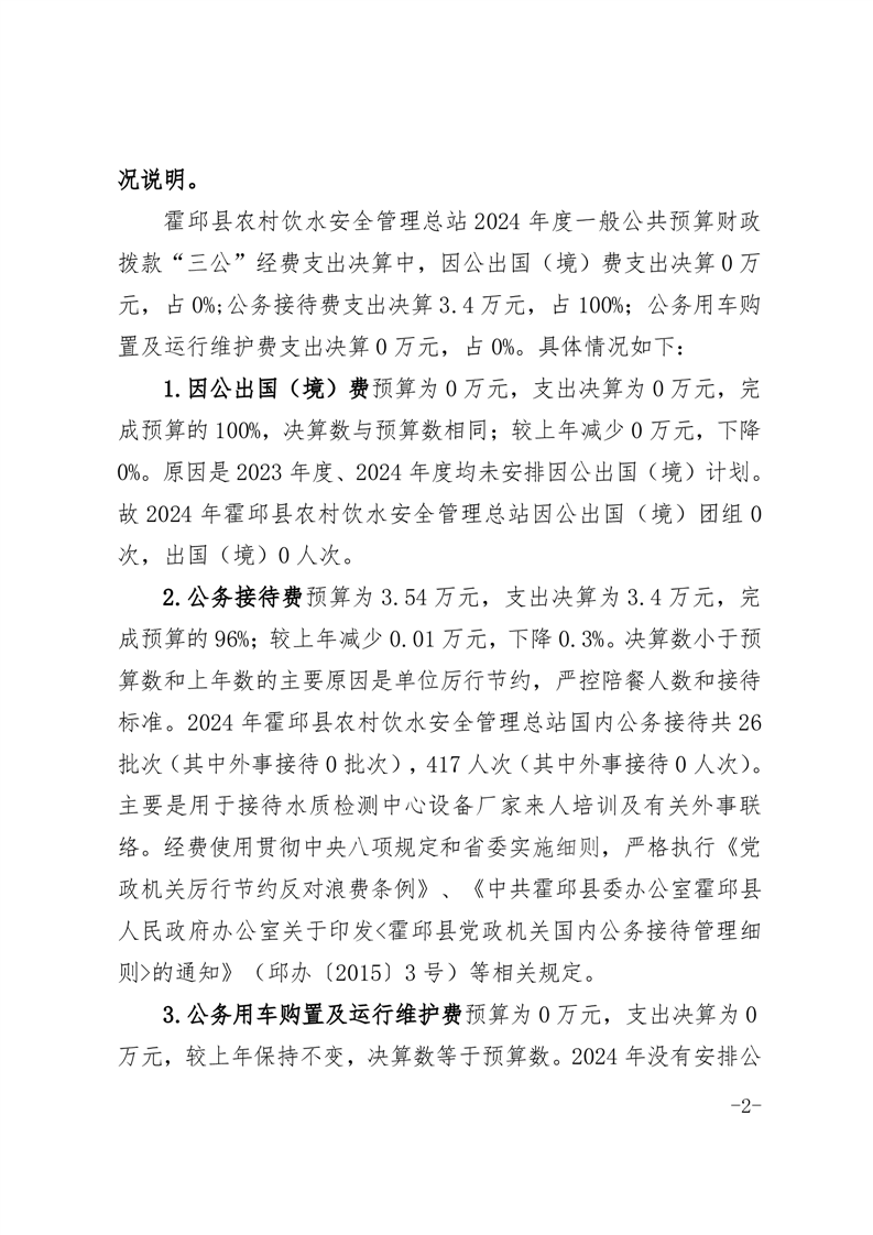 霍邱县农村饮水安全管理总站2024年度一般公共预算财政拨款“三公”经费支出决算
