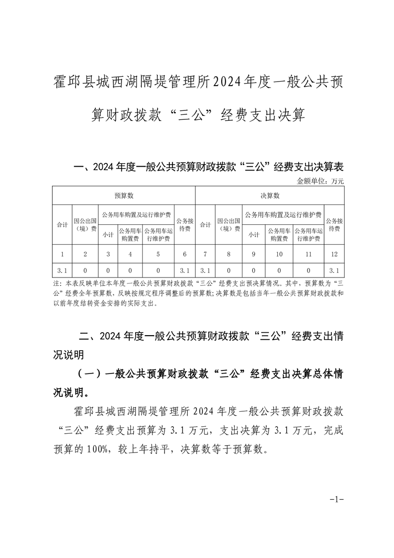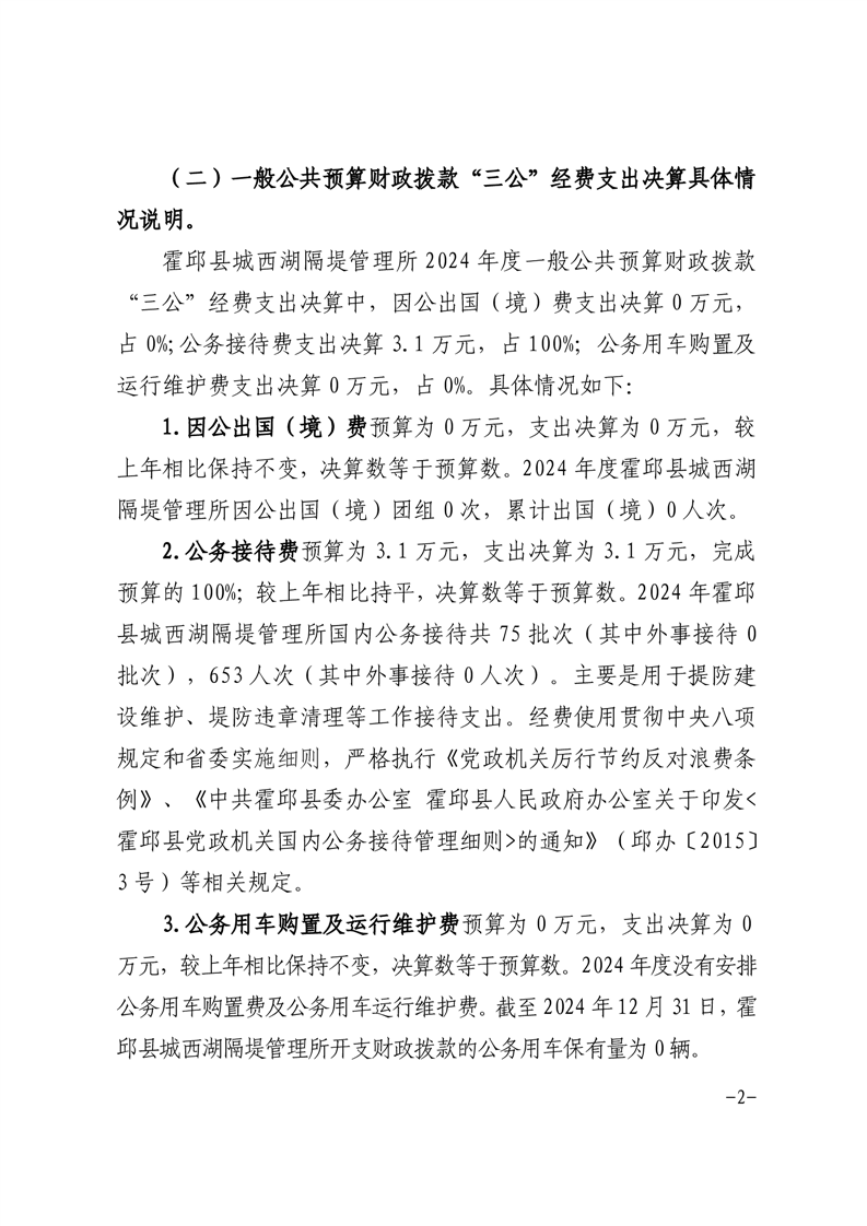 霍邱县城西湖隔堤管理所2024年度一般公共预算财政拨款“三公”经费支出决算