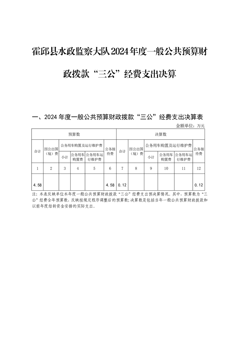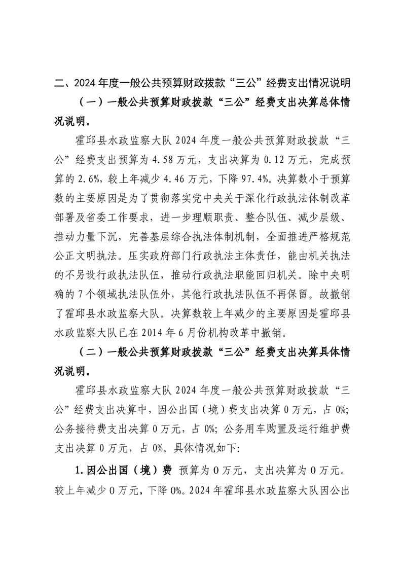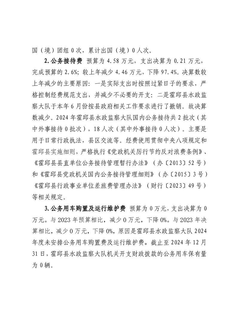 霍邱县水政监察大队2024年度一般公共预算财政拨款“三公”经费支出决算