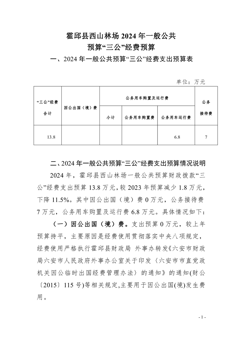 霍邱县西山林场2024年一般公共预算安排“三公”经费公开