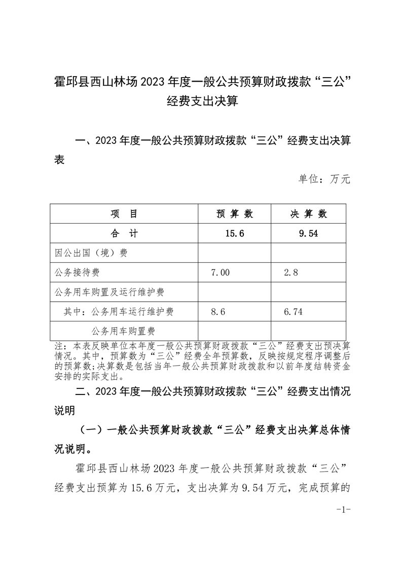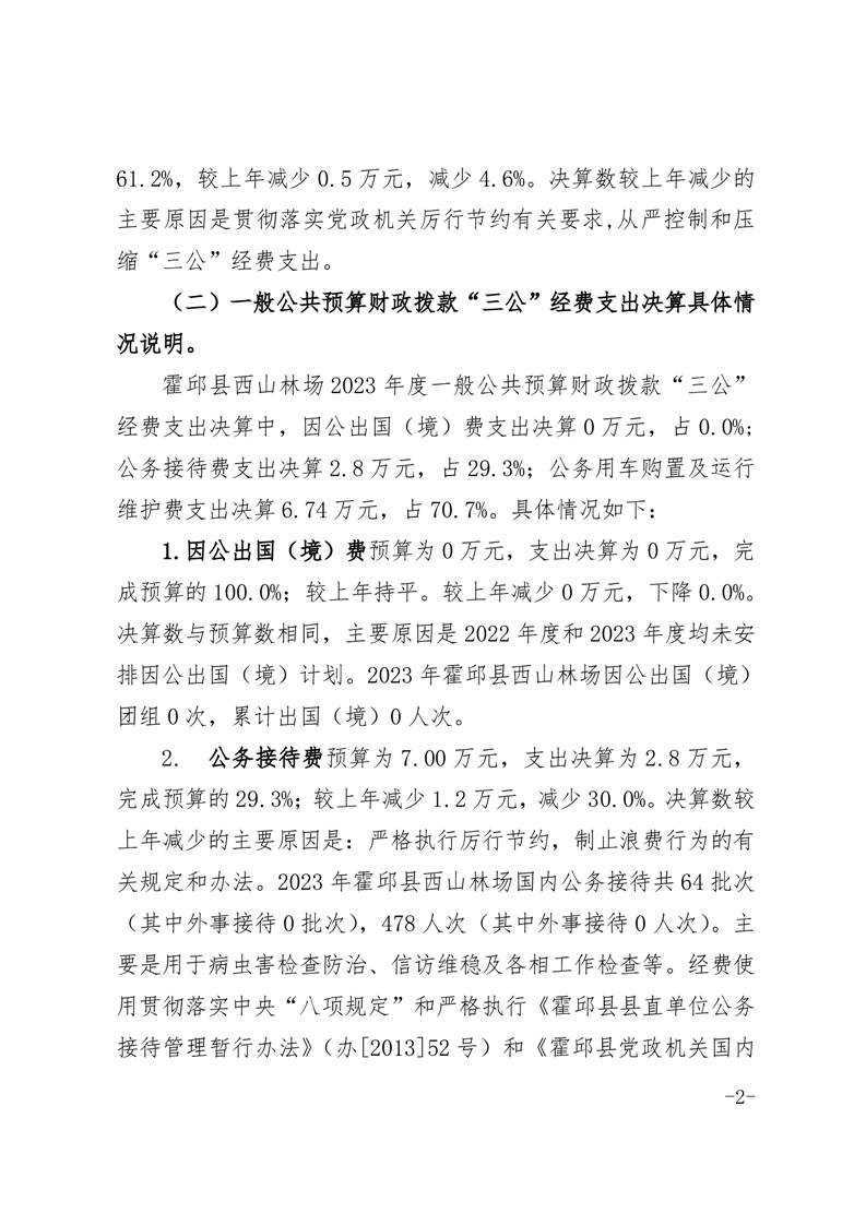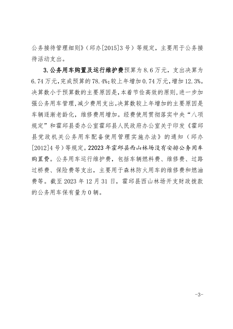 霍邱县西山林场2023年度一般公共预算财政 拨款“三公”经费支出决算